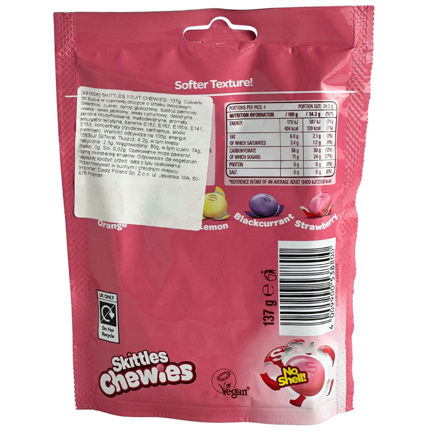 Жувальні цукерки з фруктовим смаком Fruits Skittles Chewies No Shell 137g
