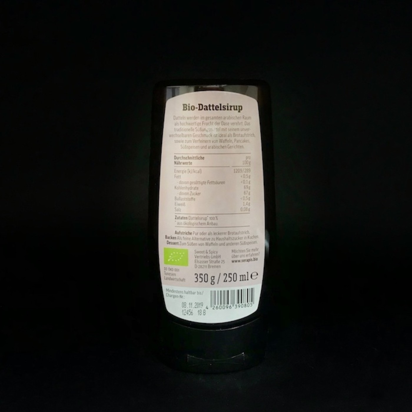 Dattel sirup – це натуральний фініковий сироп, який має особливий смак. Фініки шанують у всьому світі, вони малокалорійні та містять безліч корисних речовин. В складі немає жодних додаткових інгредієнтів, лише вирощені в екологічно чистих умовах фініки. Продукт не містить цукру, тому підходить людям, які страждають від цукрового діабету.
