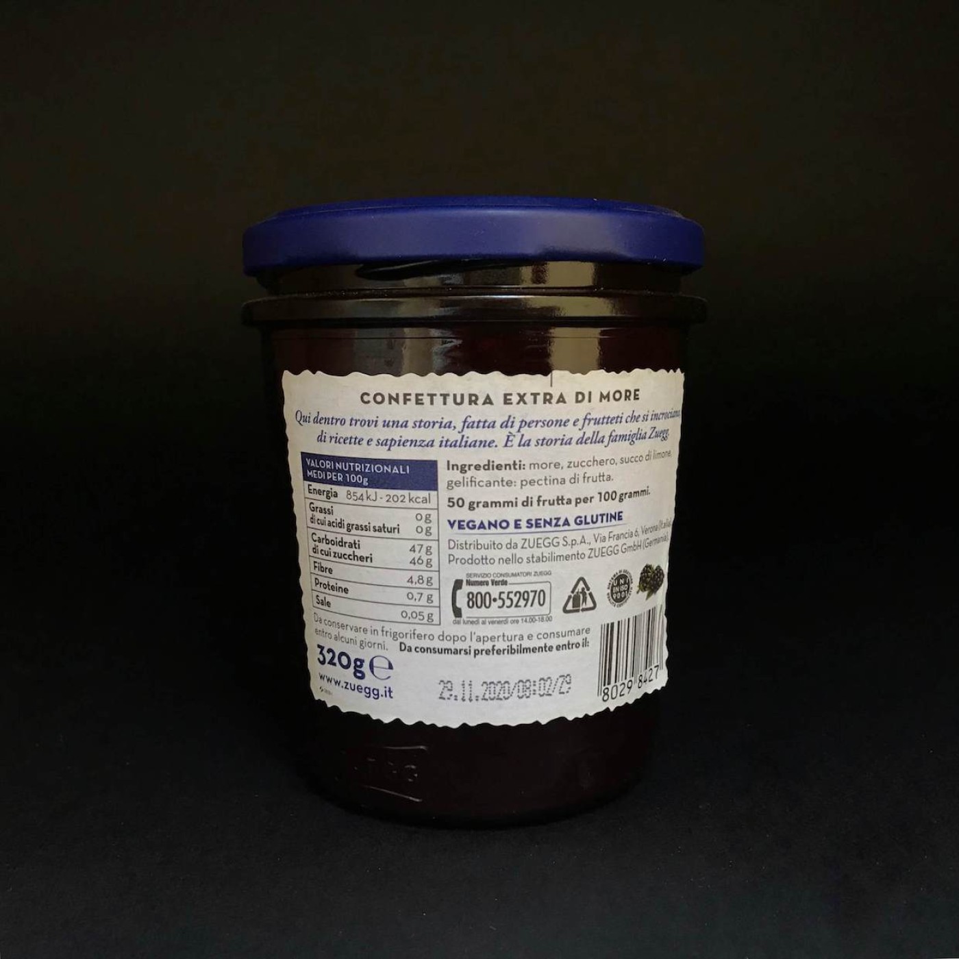 Чорничний конфітюр від Zuegg виготовлений з відбірних ягід, він має особливий смак та містить дрібні шматочки ягід. Сімейна компанія приділяє увагу якості продукції, усі фрукти та ягоди походять з власних садів, які знаходяться в Італії, тому можна бути впевненим, що смачний продукт принесе лише користь. Він не містить глютену, що дозволяє споживати його усім, хто притримується особливої дієти, а також підходить веганам.