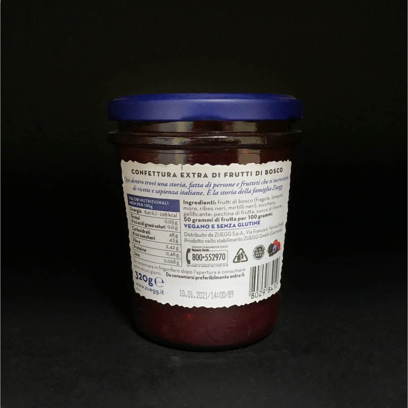 Frutti di Bosco від Zuegg – це високоякісний конфітюр з лісових ягід, який має характерний солодкий смак та містить дрібні шматочки ягід. В складі: малина, полуниця, ожина, чорна смородина та чорниця, які утворюють смачну композицію. Продукт повністю веганський, а також він не містить глютену, тому підходить людям, які притримуються веганської та безглютенової дієти.