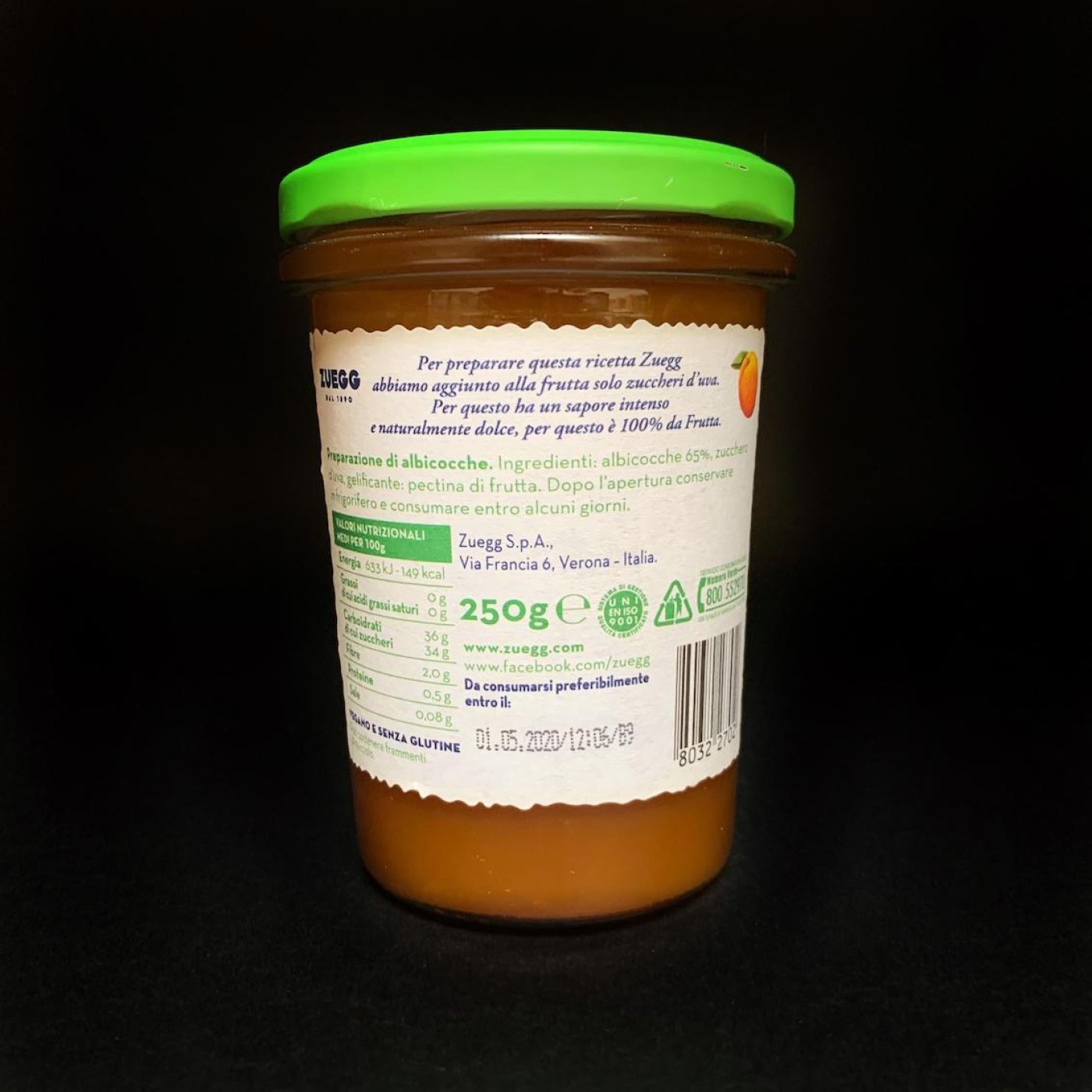 Абрикосовий конфітюр від Zuegg має приємний насичений смак, який дозволяє відчути атмосферу літа в будь-яку пору року. Це на 100% натуральний продукт, який містить 65% абрикосів, виноградний цукор та фруктовий пектин. Він не містить глютену і його обирають вегани та всі, хто обирає виключно якісні і натуральні продукти.