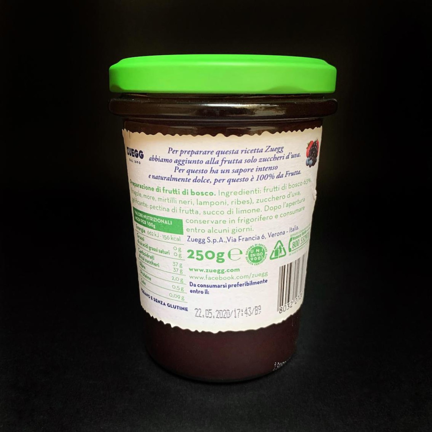 Конфітюр Zuegg Frutti di Bosco складається на 100% з натуральних інгредієнтів, тому на нього варто звернути увагу. В складі містяться лісові ягоди (63%): малина, чорниця, смородина, полуниця та ожина. Замість звичайного цукру виробник використовує виноградний, який не має насиченого смаку. Такий продукт особливо смакуватиме усім, хто надає перевагу менш солодким та корисним продуктам. До того ж, ягідний конфітюр підходить веганам та людям, які дотримуються безглютенової дієти.