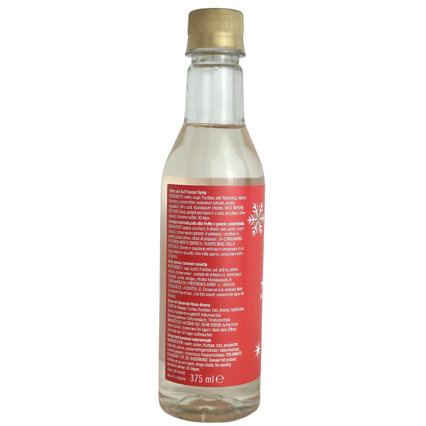 Склад: вода, цукор, натуральні ароматизатори (іриска, горіх), карамельний барвник, лимонна кислота.
