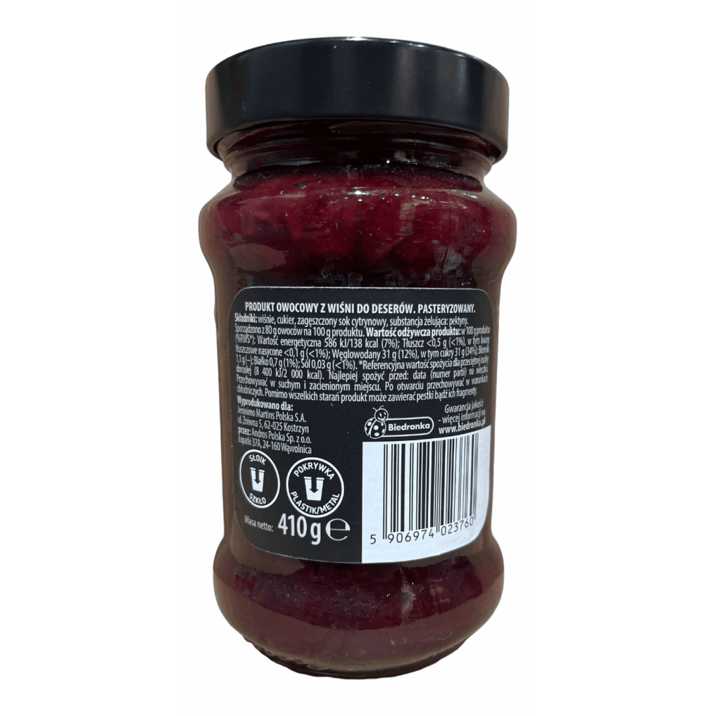 Джем з вишні Wisnia Biedronka 410ml - це натуральний продукт зі смаком сочних та ароматних вишень. Він відзначається своєю насиченою текстурою та приємним, натуральним смаком. Ідеальний варіант для поширення на хліб, використання у випічці або для створення десертів. Джем Wisnia Biedronka - це смачна насолода для вашого сніданку або перекусу, яка приправить ваші страви яскравими відтінками вишні.