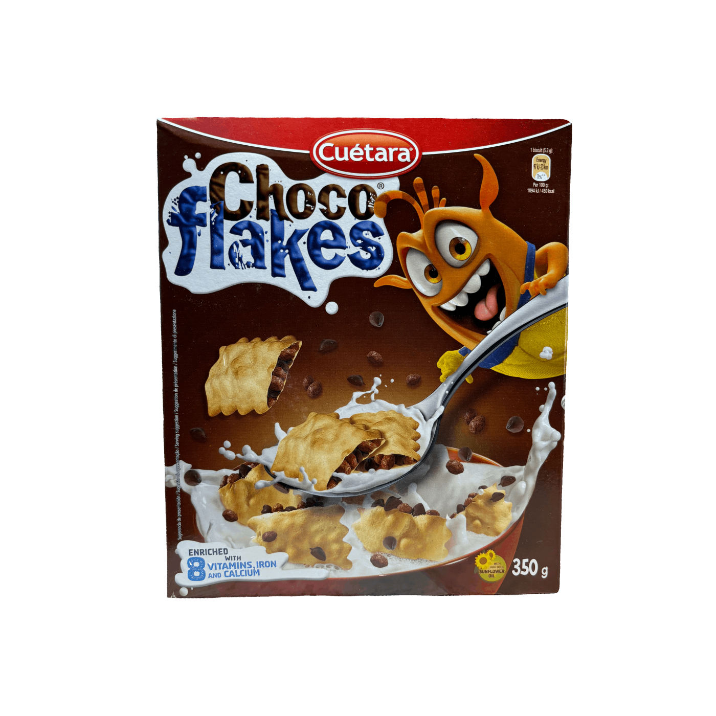 Готовий сніданок з шоколадом Cuetara Choco Flakes чудовий сніданок для вашої малечі і для вас. Це хрустке печиво наповнене какао кульками та шоколадними краплями просто тане у молоці і дарує вам неймовірний смак. Його можна їсти на перекус як печиво, ну і звичайно з молоком до сніданку. Це не просто смачно,але й корисно, адже в складі є 8 вітамінів, серед них A, D, E та вітаміни групи B, а також залізо та кальцій. Для виготовлення використовують соняшникову олію.  Наповнюйте кожен ранок смакотою.