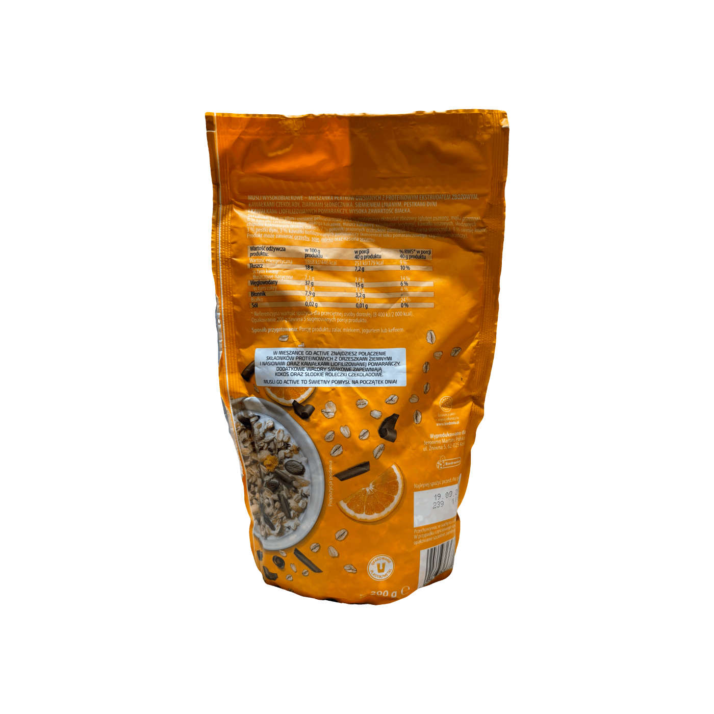 Мюслі без цукру з шоколадом та апельсином - це добре складений продукт, який забезпечує огранізму енергетичну основу, тобто вуглеводи. Ці чудові білкові мюслі містять 30 г білка на 100 г продукту, а також насіння гарбуза та льону, горіхи, сублімовані фрукти. Це ідеальне джерело енергії для роботи м'язів, тому вживайте їх за 2-3 години до тренування і вам забезпечений належний енегретичний обмін та зниження відчуття втоми.