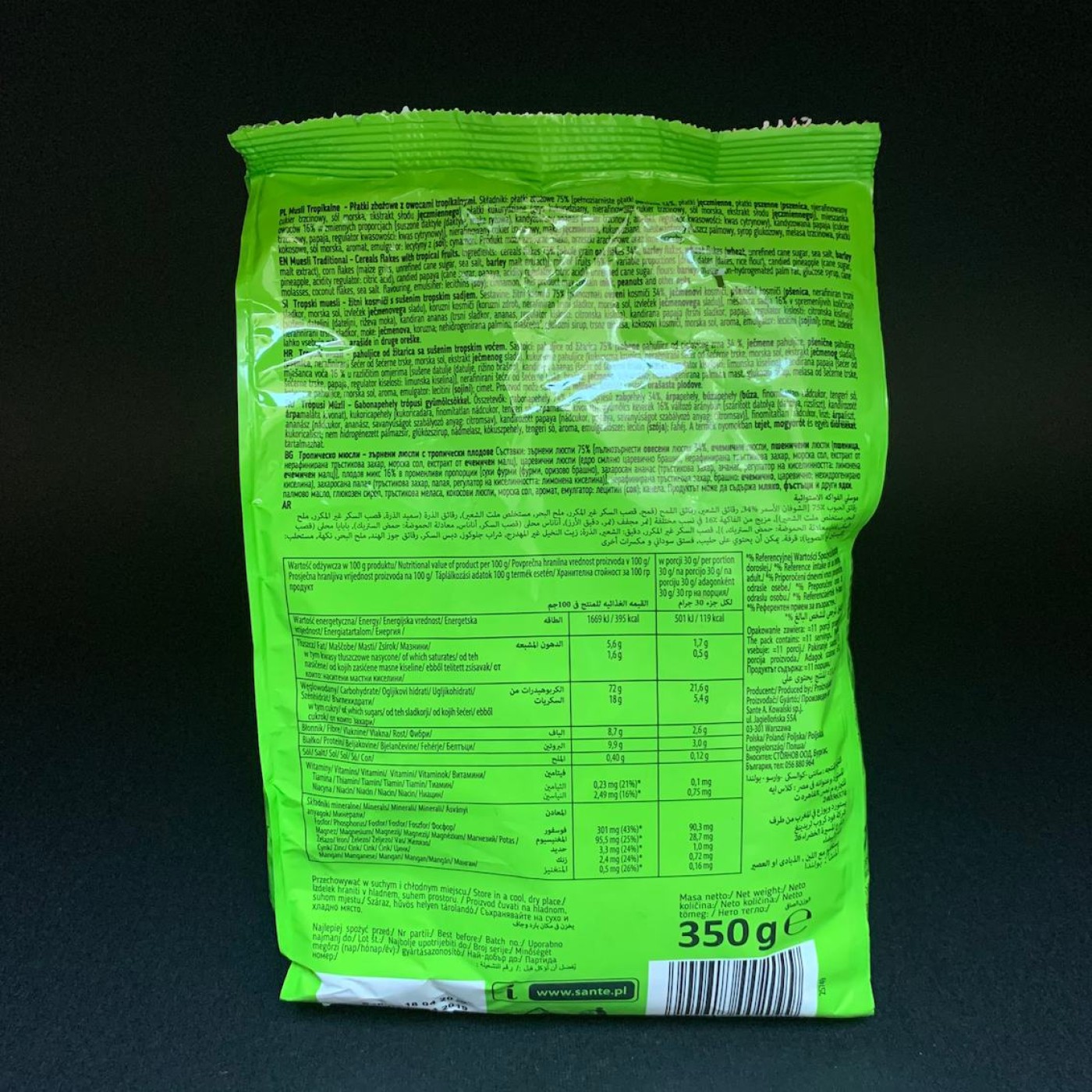 Усім поціновувачам тропічних фруктів неодмінно припадуть до смаку мюслі tropical від Sante. Вони складаються з цільнозернових вівсяних, ячмінних, пшеничних та кукурудзяних пластівців з додаванням сушених фініків, ананасу та папаї. Такі інгредієнти однозначно подарують особливий смак, а також користь завдяки вмісту злаків: мінерали, антиоксиданти та вітаміни.
