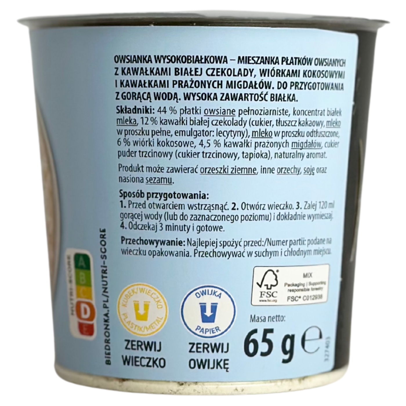 Вівсяна каша з білим шоколадом та кокосовою стружкою це - швидкий та простий спосіб перекусити, якщо часу зовсім мало. Їжа швидкого приготування ідеально підходить для ситуацій, коли у вас обмежений час, наприклад, у перервах на роботі або під час подорожей, займає набагато менше часу, аніж традиційні страви, що особливо важливо для зайнятих людей. Вівсянка - це продукт, що отримується з оброблених та очищених зерен вівса. Крупа має високий вміст клітковини та корисних поживних речовин, таких як бета-глюкан, який благотворно впливає на здоров'я серцево-судинної системи. Вівсяна каша моментального приготування має дивовижний смак та аромат. Достатньо просто залити вміст окропом, ретельно перемішати, і ваша їжа готова.