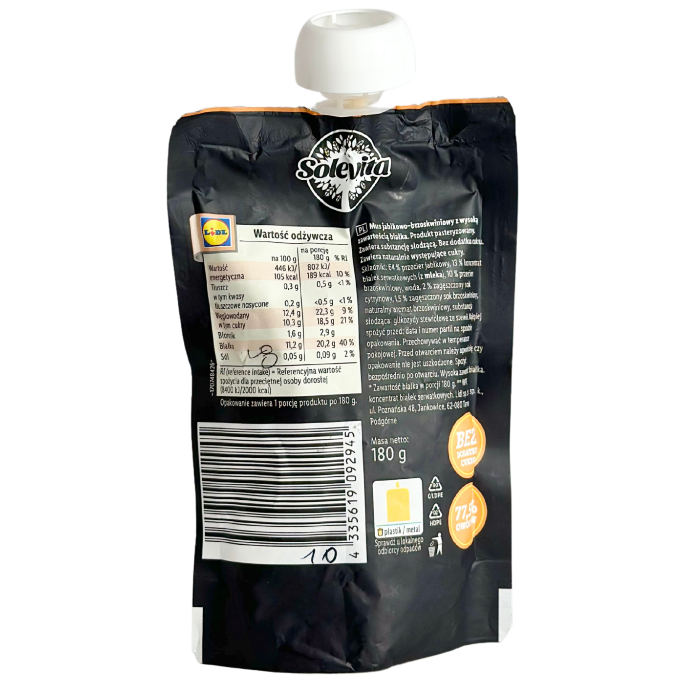 Протеїновий фруктовий мус без цукру зі смаком яблука та персика High Protein Mus Solevita 180g