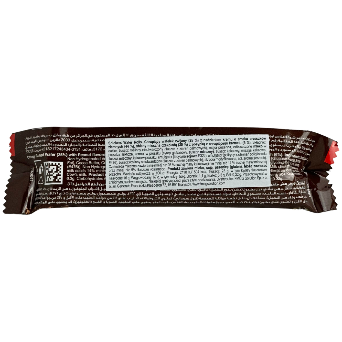 Snickers Wafer Rolls — це новий формат знайомого смаку. Хрусткі вафельні трубочки, наповнені карамеллю, арахісовим кремом і вкриті ніжним молочним шоколадом. Зручна форма для перекусу, справжній Snickers-смак у новій текстурі