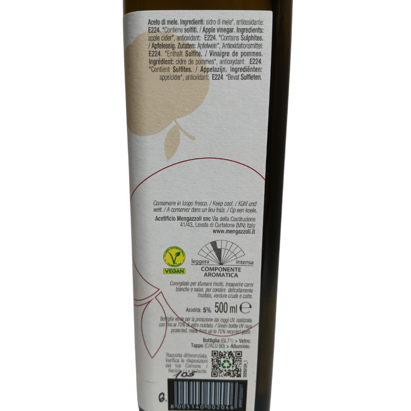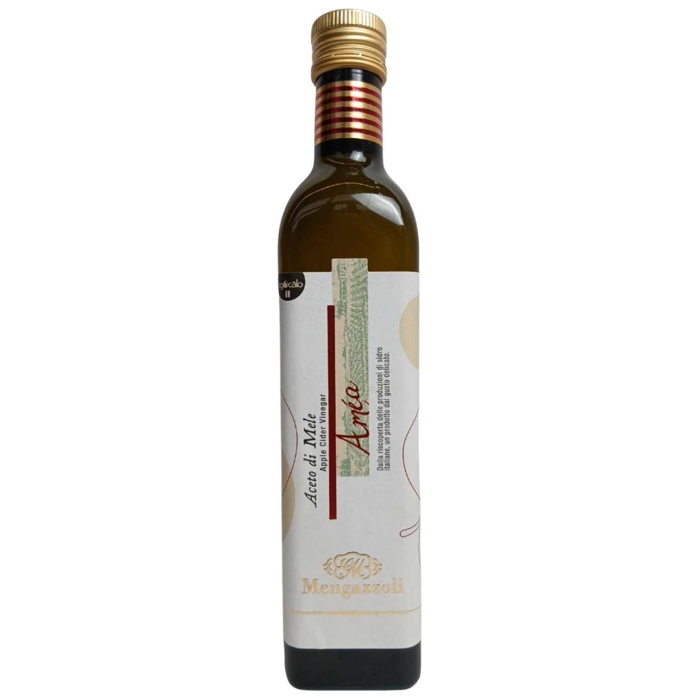Яблучний оцет Amea aceto di mele від виробника Mengazzoli — це натуральний італійський оцет, виготовлений шляхом бродіння яблучного сидру. Він має м'який, фруктовий смак та приємний аромат яблук, що робить його універсальним інгредієнтом у кулінарії та дієтології.