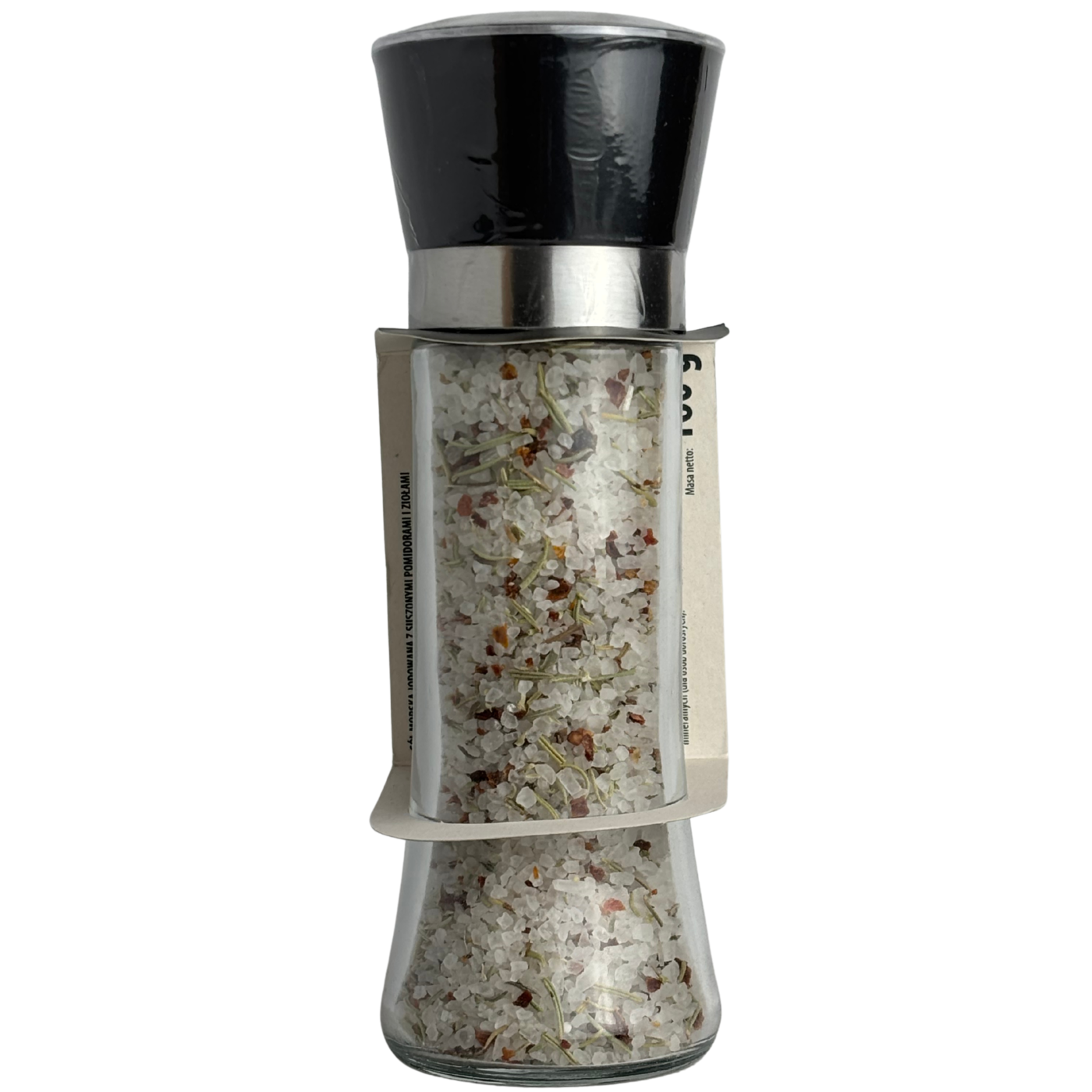 Морська сіль йодована в млинку, з додаванням сушених подрібнених томатів, розмарину та орегано додасть неповторного смаку та аромату вашим стравам. Відрізняється від звичайної кухонної солі значно більшим вмістом мінералів та мікроелементів – K, Mg, Ca, Mn, Cu, Fe, Zn та додатково збагачена йодом.