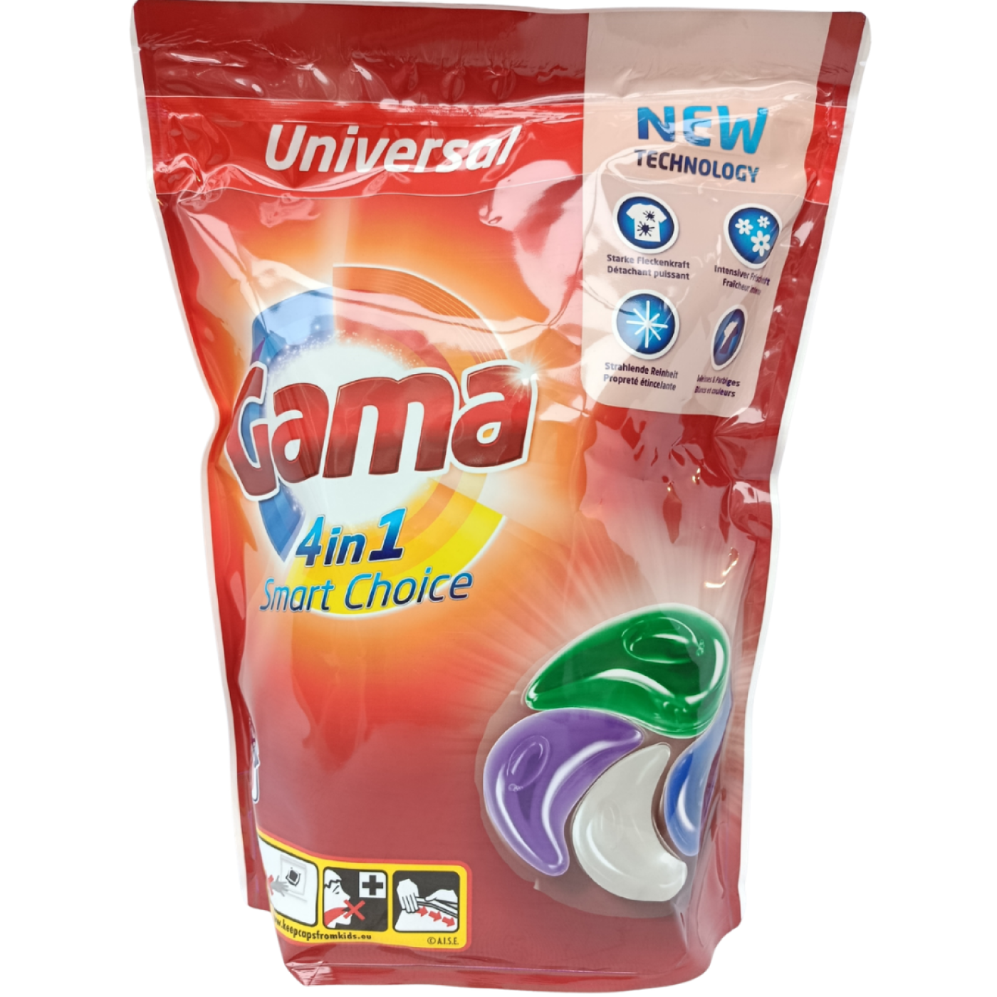 Капсули для прання Gama 4в1 Smart Choice Universal призначені для ефективного прання білих і кольорових речей. Інноваційна формула 4в1 поєднує дію миючого засобу, плямовивідника, кондиціонера та компонента, що допомагає запобігати утворенню накипу в пральній машині. Капсули добре розчиняються у воді, ефективно видаляють забруднення та залишають приємний аромат свіжості на одязі.