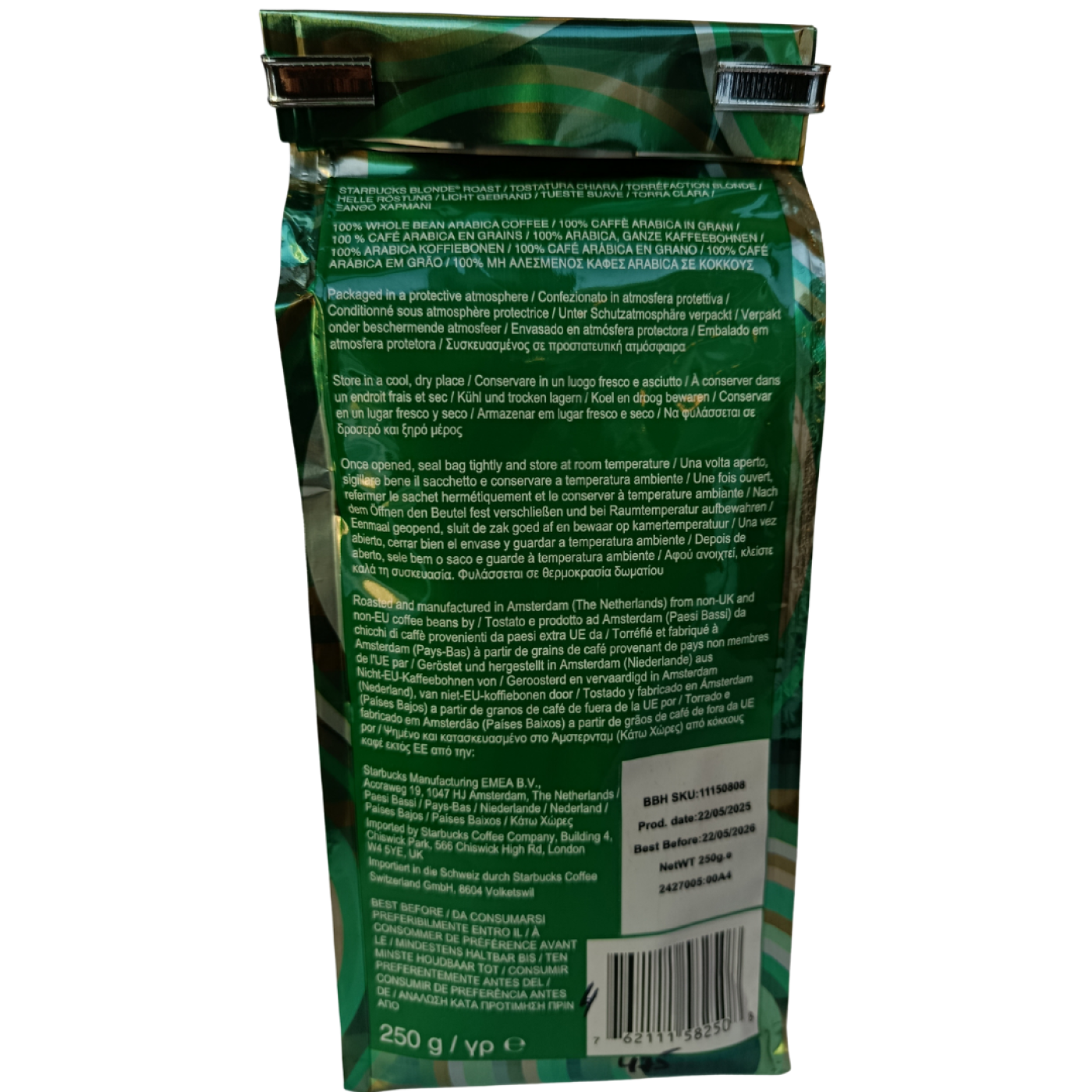 Blonde Espresso roast Starbucks – кава в зернах від одного з найбільш популярних брендів у світі. Зерна повільно та слабо обсмажені, тому вона характеризується ніжним і м’яким смаком з солодкою ноткою. Зерна походять з Латинської Америки, вони ретельно відбираються і, в подальшому, використовуються лише найкращі. Саме цей різновид кави відмінно підходить для поціновувачів делікатних смаків та любителів кавового напою з додаванням молока.