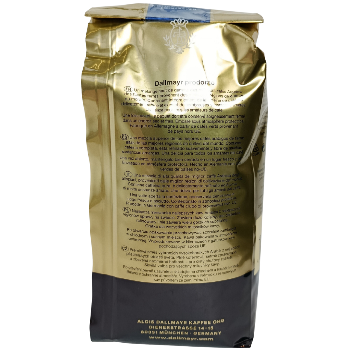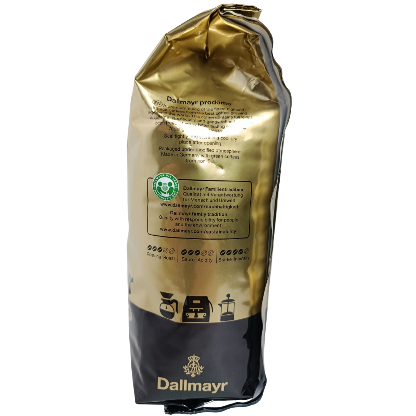 Кава в зернах Prodomo від відомого виробника Dallmayr – це якісний продукт, виготовлений зі 100% арабіки, яка надає м’якість без надмірної гіркоти. Композиція зерен з Ефіопії, Гватемали та Індії дарує насичений смак, неймовірний аромат та легку шоколадну нотку.