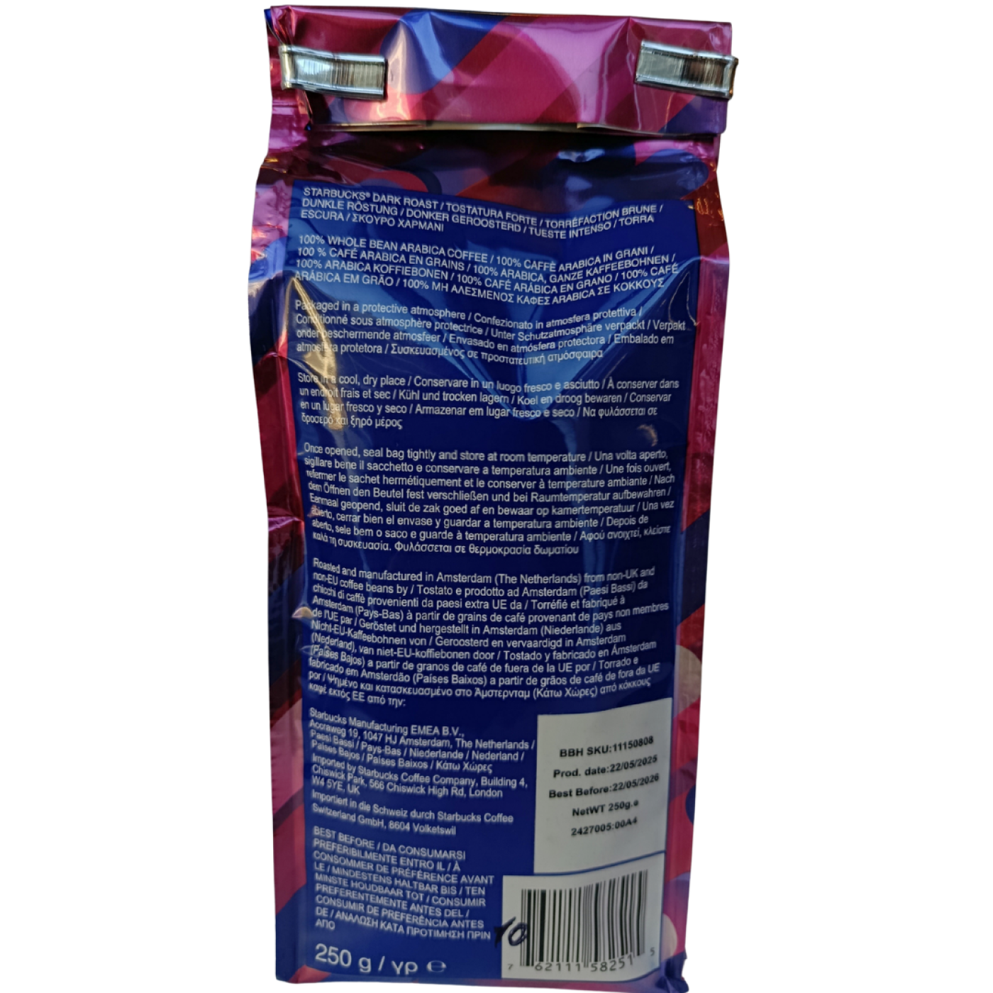 Espresso roast від Starbucks – насичена кава в зернах, яка має особливу та солодку нотку карамелі. Саме цей різновид кави використовують для приготування кавових напоїв на основі еспресо, які подають в відомій мережі кав’ярень Старбакс. Вона характеризується насиченим солодко-гірким смаком з ледь відчутною кислинкою. Чудовий вибір, аби зарядитись енергією.
