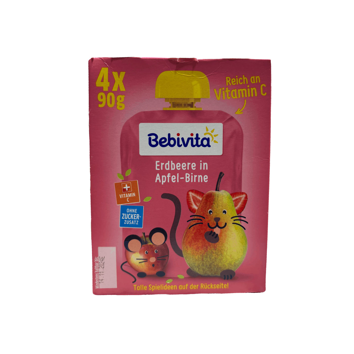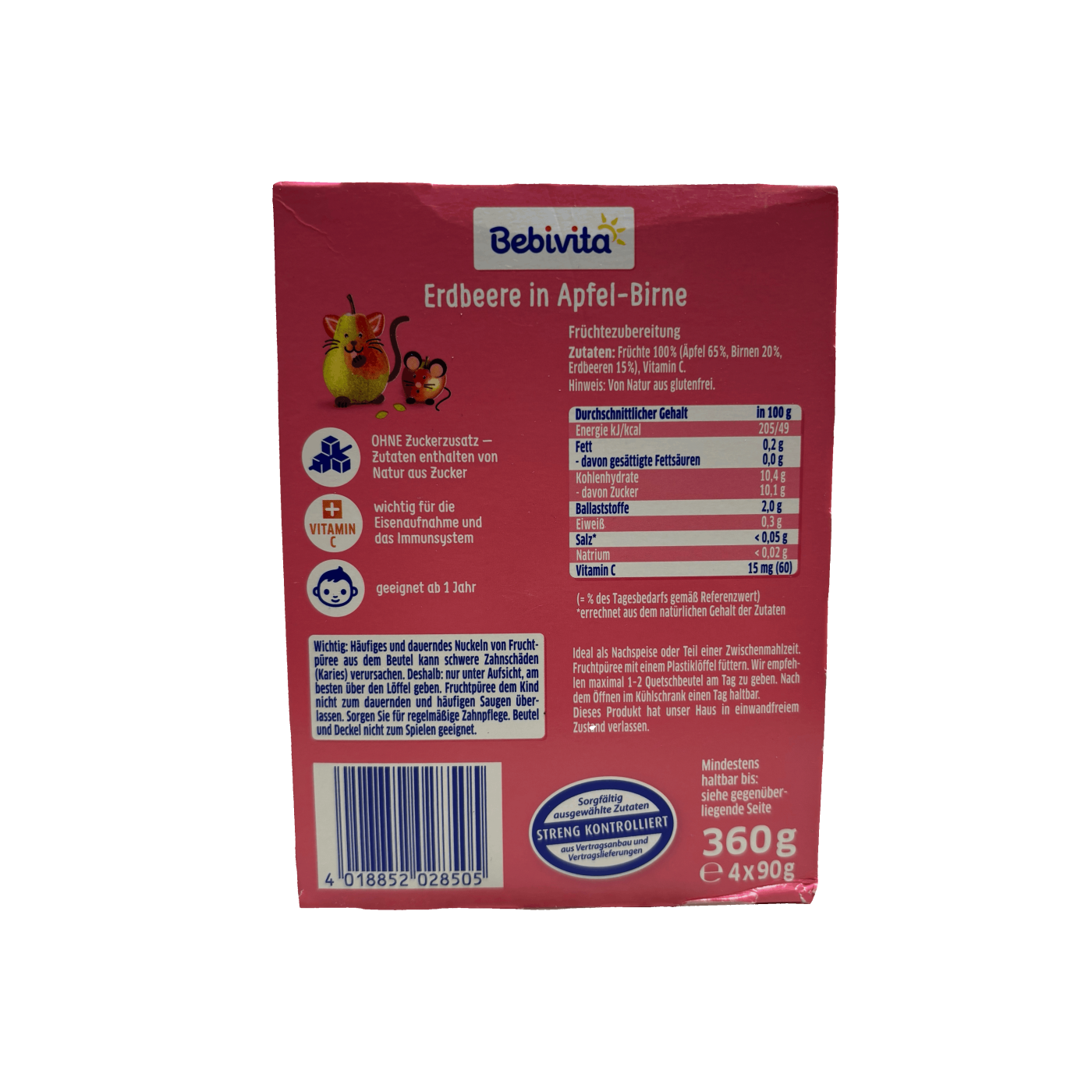 Дитяче фруктове пюре яблуко-груша-полуниця від 1 року Erdbeere-Apfel-Birne Bebivita 4*90g