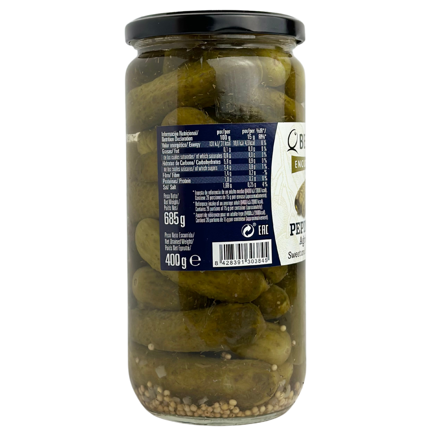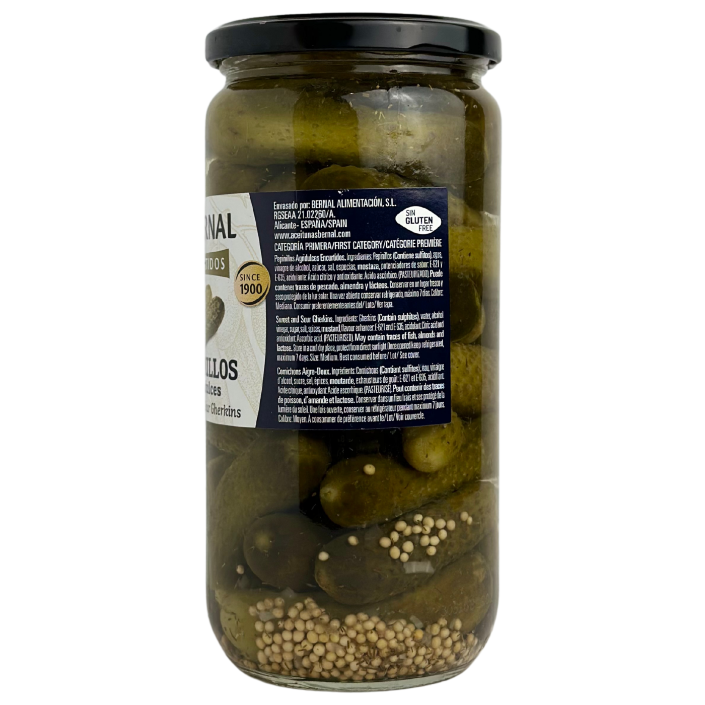 Корнішони кисло-солодкі Bernal Pepinillos 685 г — це хрусткі та ароматні корнішони з гармонійним поєднанням кислинки і солодощі. Виготовлені за традиційним рецептом, вони додають особливий смак до будь-якої страви.