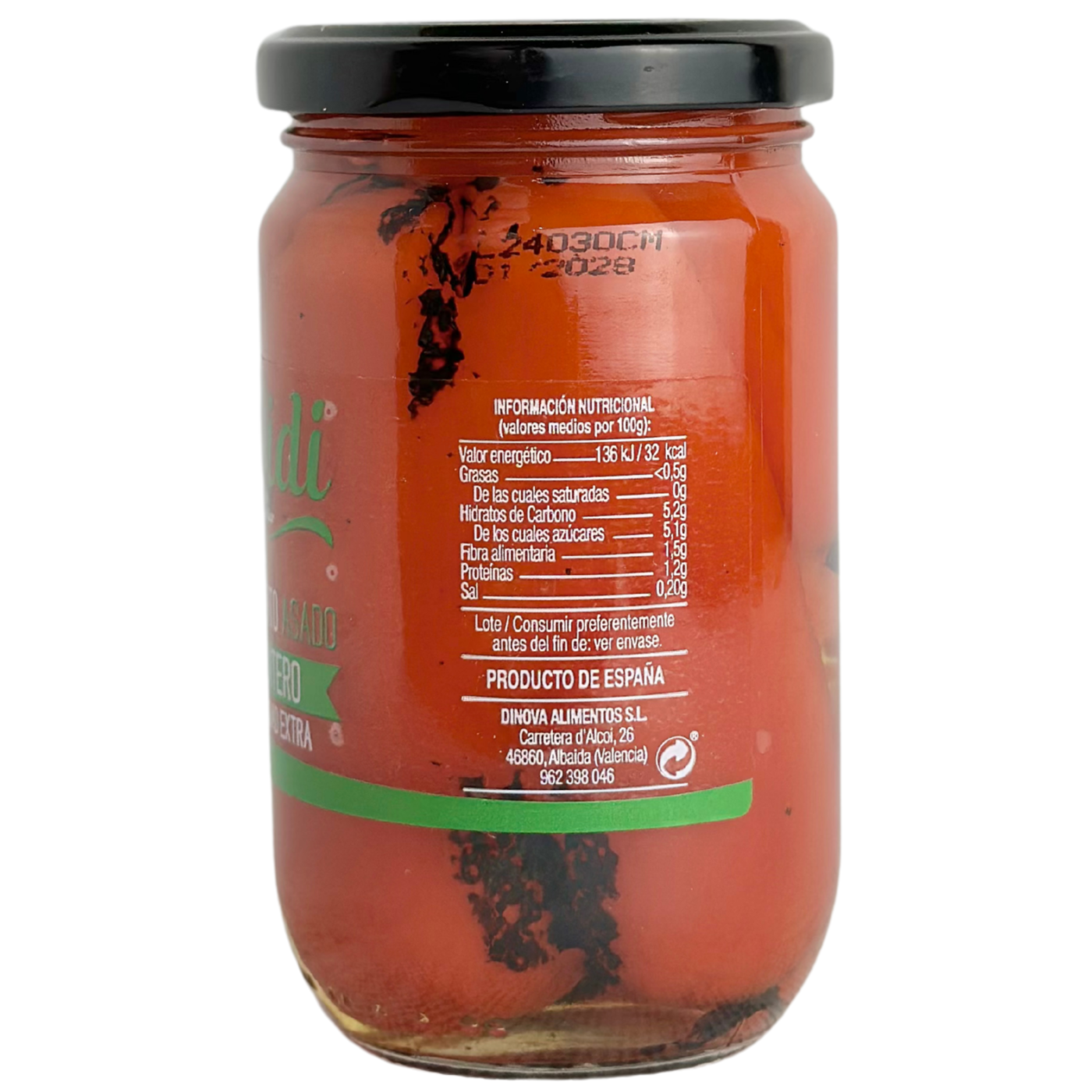Перець червоний грильований Pimiento Asado Didi - соковитий і ароматний перець, обсмажений на грилі для насиченого, трохи солодкуватого смаку з легкою димною ноткою. Ідеально підходить для салатів, закусок, бутербродів або як гарнір до основних страв. Його яскравий колір і насичений аромат роблять страви більш апетитними та додають середземноморського характеру кожній порції.