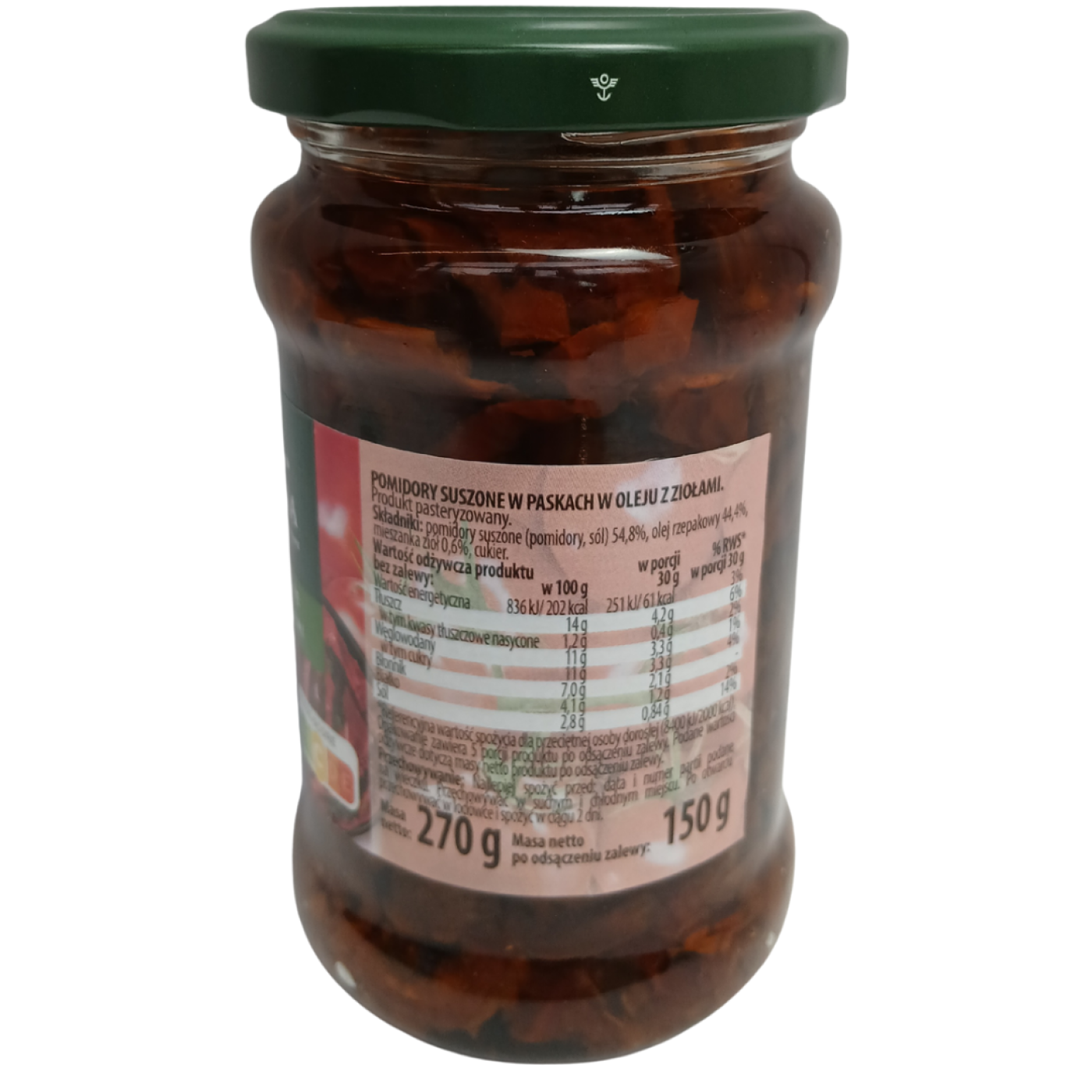 В'ялені томати з травами різані Nasza Spiżarnia 270 г — це смачна і ароматна закуска, що перенесе вас у середземноморську атмосферу. Соковиті в'ялені томати, вирощені на сонці, мариновані у суміші оливкової олії, часнику та ароматних трав, таких як орегано, базилік і чебрець. Вони мають насичений, концентрований смак з легкою пряною ноткою, що робить їх ідеальними для пасти, піци, салатів або як самостійну закуску. В'ялені томати з травами — це справжня насолода для гурманів.