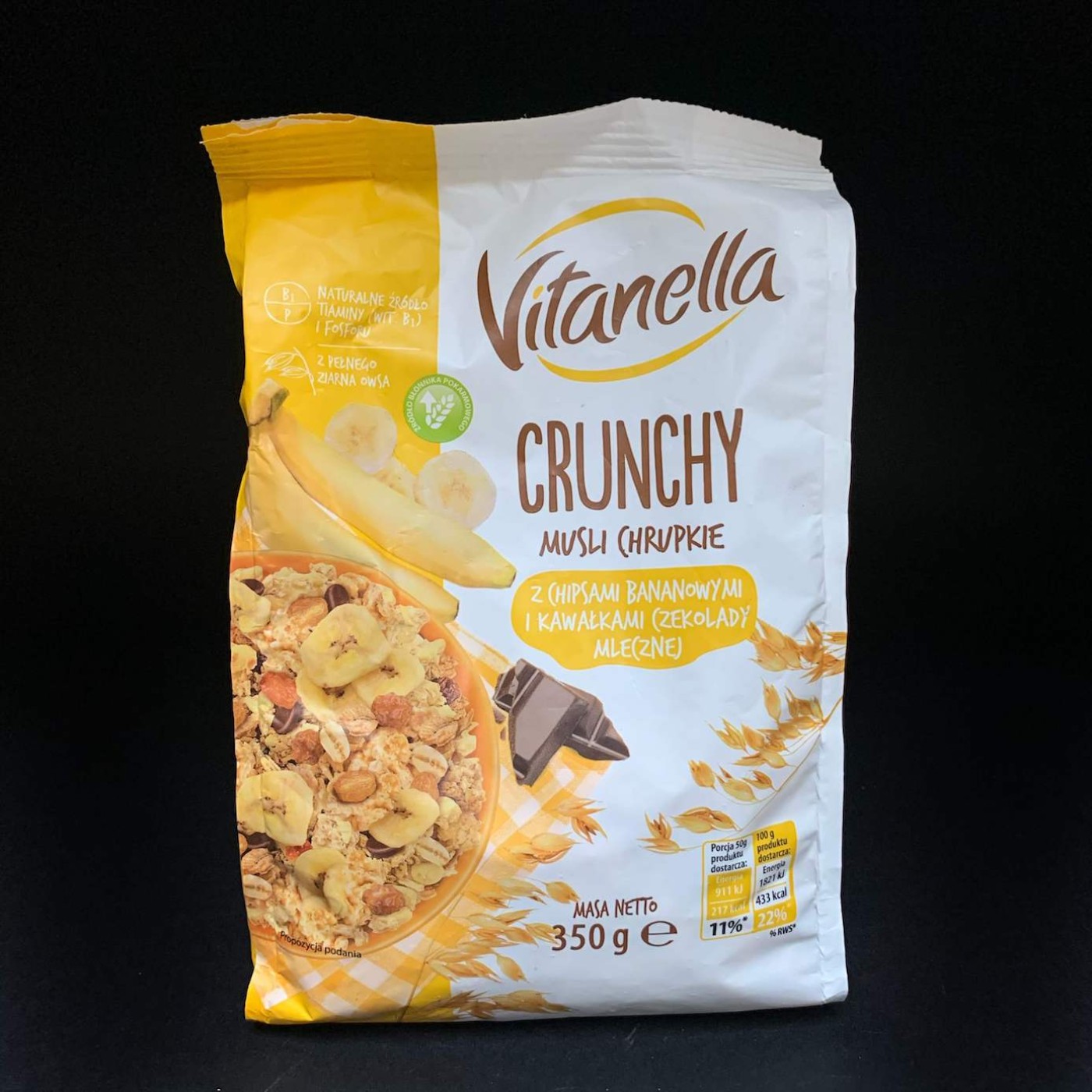 Виробник Vitanella пропонує якісну продукцію, яка сподобається всій родині та подарує багато користі. Смачні кранчі виготовлені з цільнозернових вівсяних пластівців, вони містять бананові чіпси, шматочки молочного шоколаду і родзинки, які можна вважати ідеальними додатками. Якісний продукт багатий на клітковину, вітаміни B1, P і мінерали, особливо фосфор.