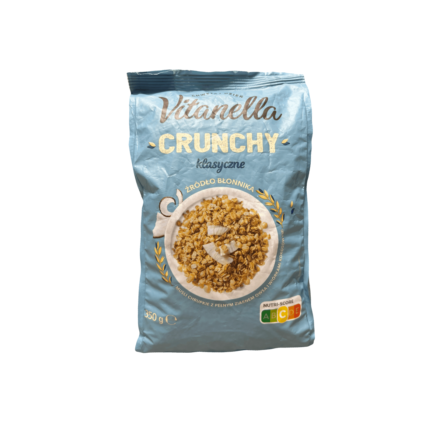 Кранчі Вітанелла виготовлені з цільнозернових вівсяних пластівців, саме тому вони багаті на клітковину, в складі також містяться кокосові пластівці, які забезпечать організм мінеральними речовинами: залізо, фосфор, кальцій та інші. Crunchy Vitanella – це високоякісний продукт, який стане альтернативою шкідливим та багатокалорійним сніданкам.