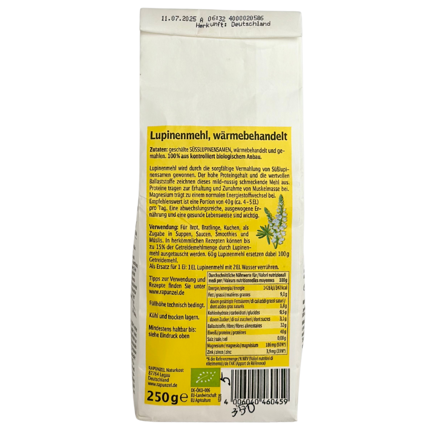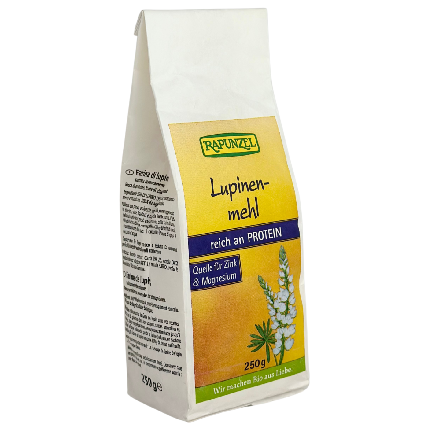 Люпинове борошно-виготовляється з подрібненого насіння люпину. Чудова заміна пшеничному борошну, адже люпинове борошно без глютену та холестерину. Чудово підійде для випічки та має низький глікемічний індекс, а отже підійде для людей з цукром діабетом. Сприяє зсвоєнню заліза, багате на протеїн. Використовують його у приготуванні тортів, кексів, булочок а також соленій випічці.