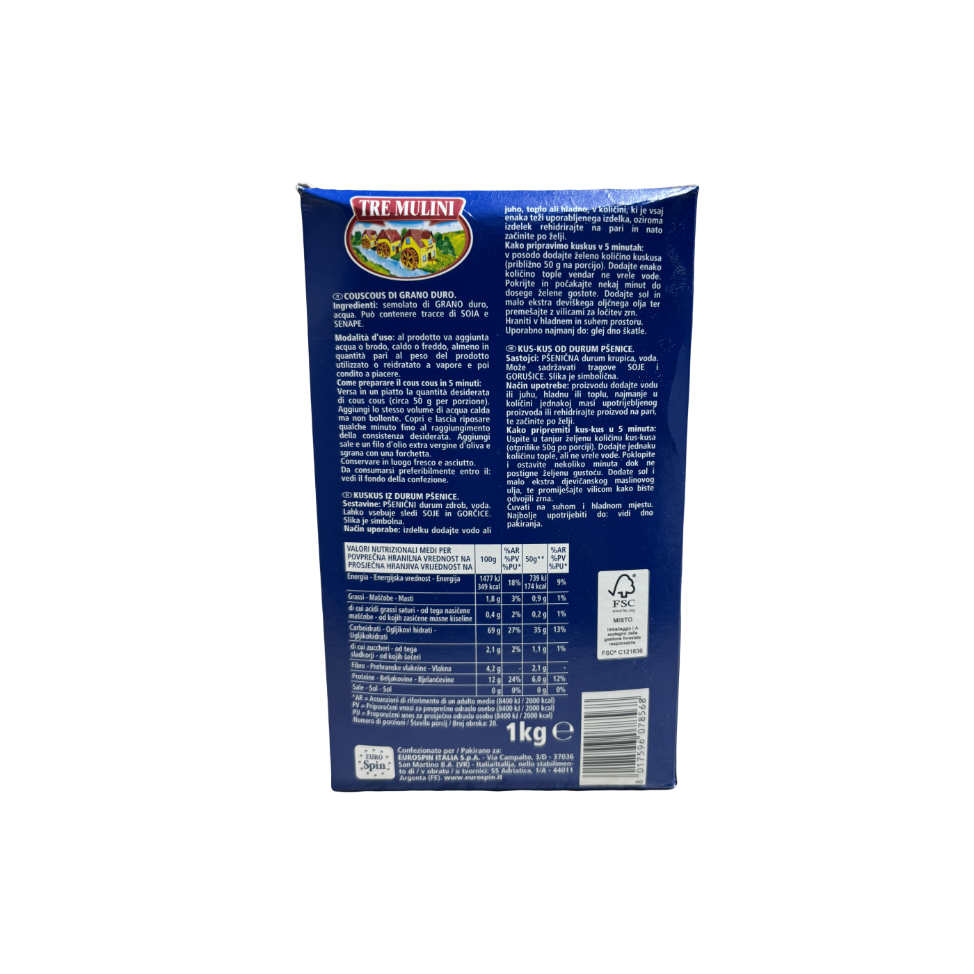 Кускус від Tre mulini - це вид пшеничних зерен, які мають м’який, ніжний смак з легкою горіховою ноткою. Текстура кускусу є дуже легкою та повітряною. Він вирощується та обробляється з особливою увагою до якості, що гарантує найвищий стандарт продукту. Забезпечує енергією та допомагає з насиченням, завдяки високому вмісту вуглеводів; Є важливим джерелом білка, необхідного для росту та відновлення тканин організму; Містить різноманітні вітаміни та мінерали, такі як вітаміни групи В, залізо, кальцій та інші корисні мікроелементи. Ідеально поєднується з овочами, м'ясом та іншими продуктами.