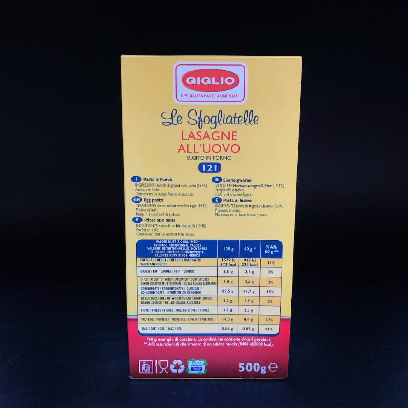 Lasagne All’uovo – це широкі листи, які використовують для лазаньї та різноманітних запіканок. Вони виготовлені з якісних інгредієнтів з додаванням яєць, тому мають м’яку і приємну текстуру. Листи для лазаньї добре тримають форму, їх не потрібно попередньо відварювати, оскільки вони стануть м’якими після запікання з соусом та начинкою. Однієї упаковки вистачить на декілька великих порцій.