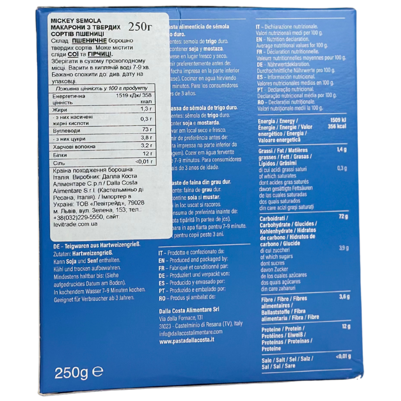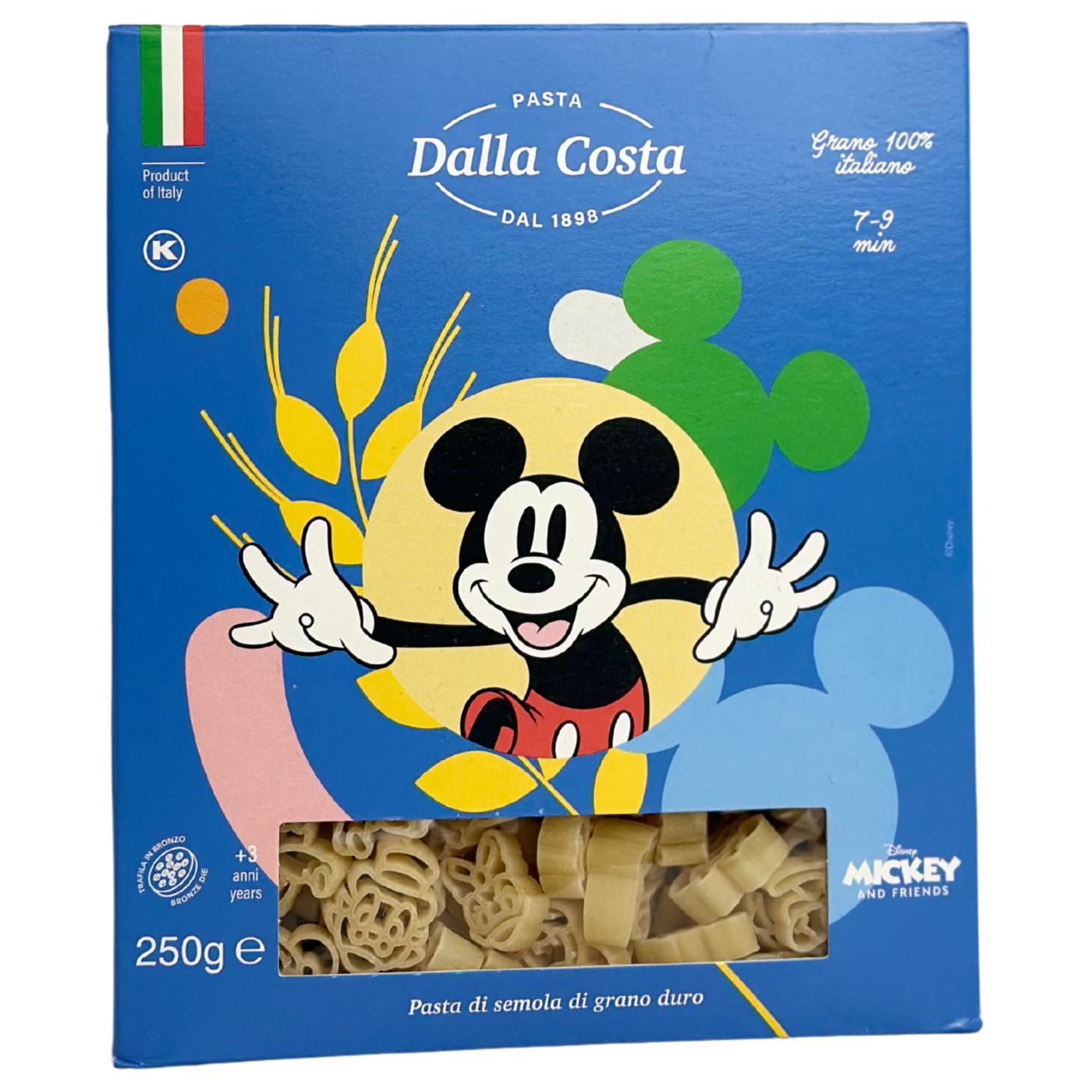 Pasta Mickey Mouse від Dalla Costa – натуральна паста, виготовлена спеціально для наймолодших споживачів від 3-ох років. Макарони мають цікаву форму у вигляді персонажу від Disney Міккі Мауса, що неодмінно сподобається маленьким дітям.