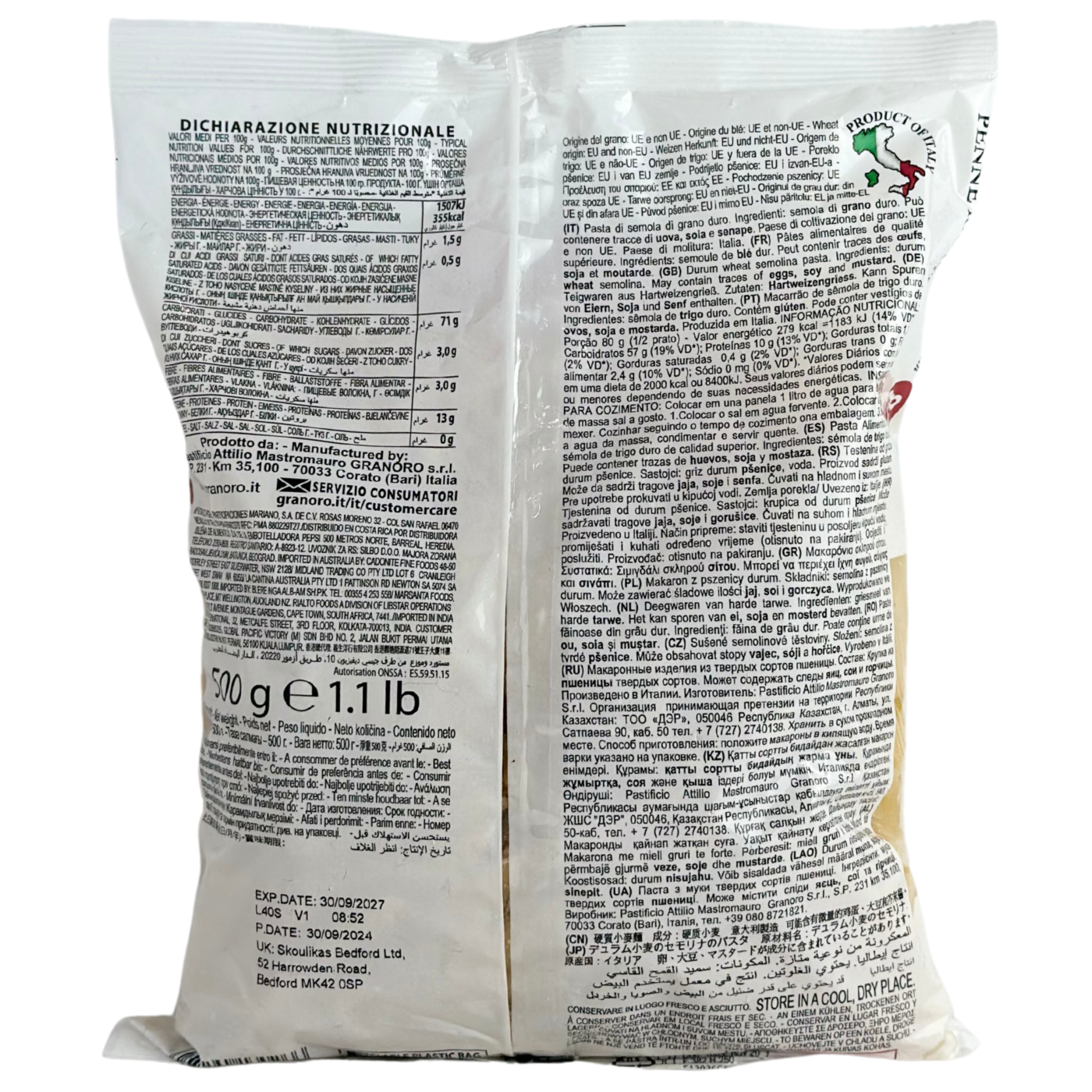 Макарони Penne Rigate Granoro - класичні італійські макарони у формі рифлених трубочок з твердих сортів пшениці, які добре утримують соус, зберігають форму після варіння і підходять для різноманітних страв. Виготовлені без штучних барвників і консервантів, мають природний золотистий колір та щільну текстуру, що дозволяє отримати ідеальну консистенцію al dente. Penne Rigate Granoro чудово поєднуються з томатними, вершковими та м’ясними соусами, підходять для запіканок та класичних італійських рецептів.