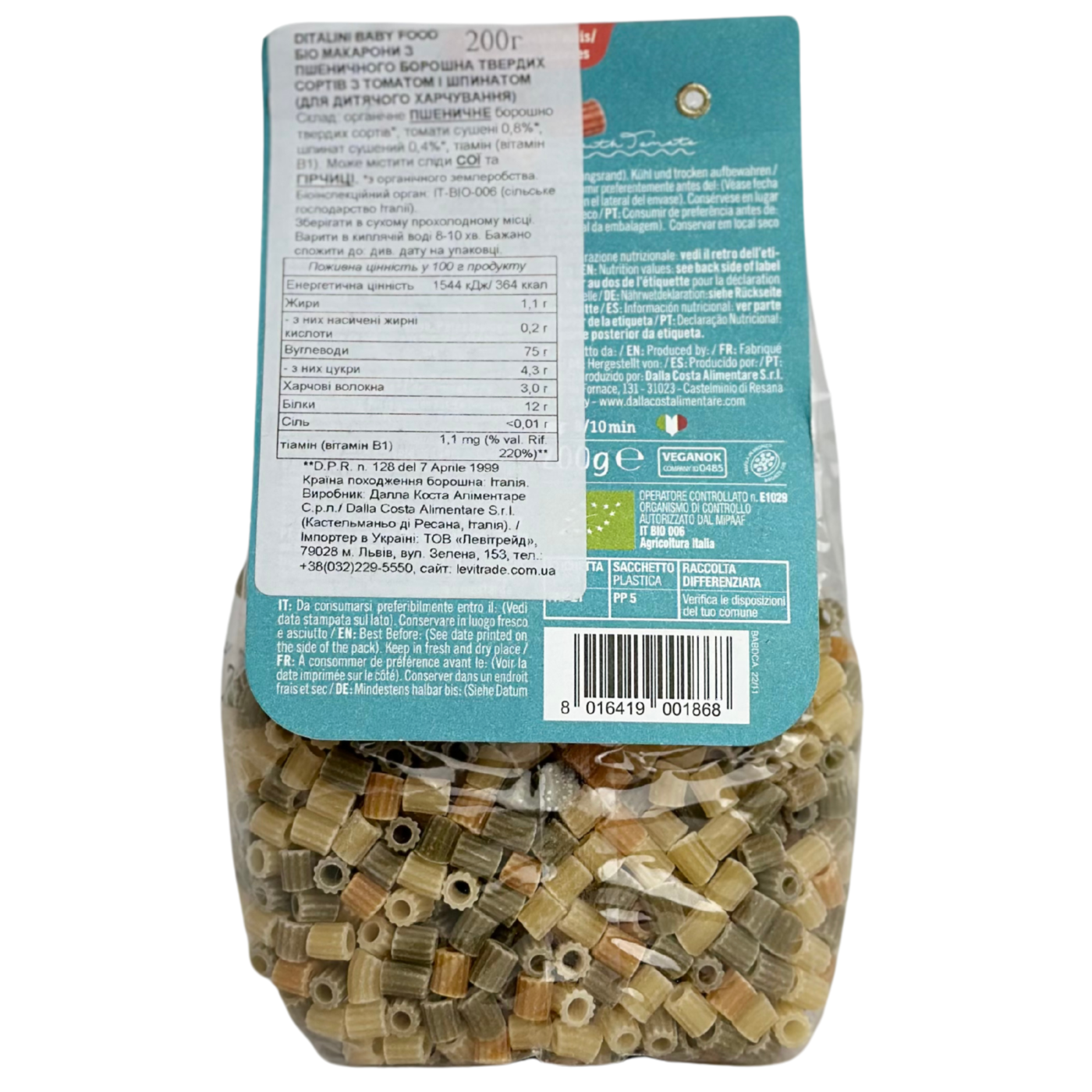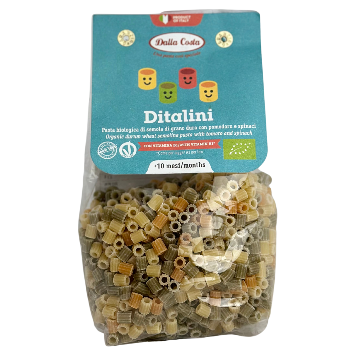 Ditalini – особливий різновид макаронів від італійського виробника Dalla Costa, який підходить для найменших споживачів, адже ними можна смакувати вже з 10 місяців! Вони мають маленький розмір та виготовлені в формі міні-деталей, неймовірно смакують і роблять прийом їжі малечі ще й цікавим. Дитячу пасту виготовляють з біо органічного пшеничного борошна твердих сортів, а кольоровими її роблять шпинат та томати. В складі також є вітамін В1 (тіамін). Міні-макарони чудово підходять для гарніру в поєднанні з улюбленими соусами та додатками, їх також можна додавати до супів.