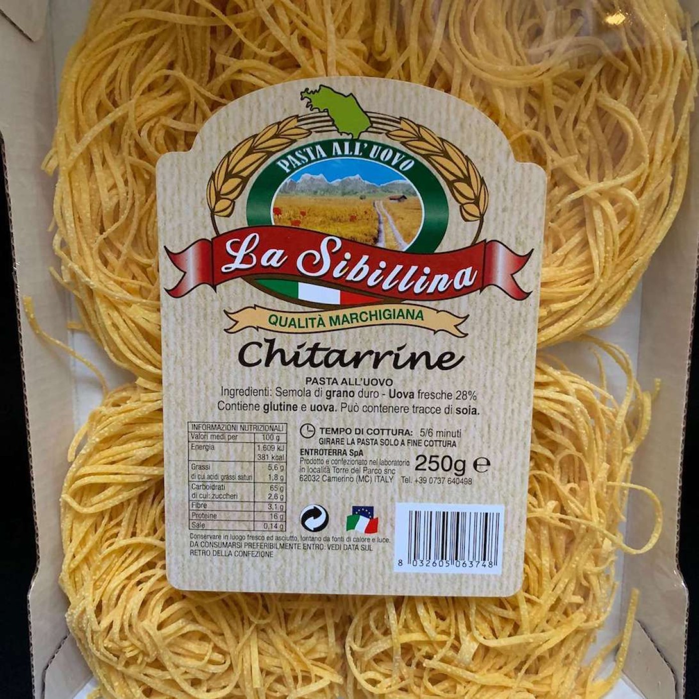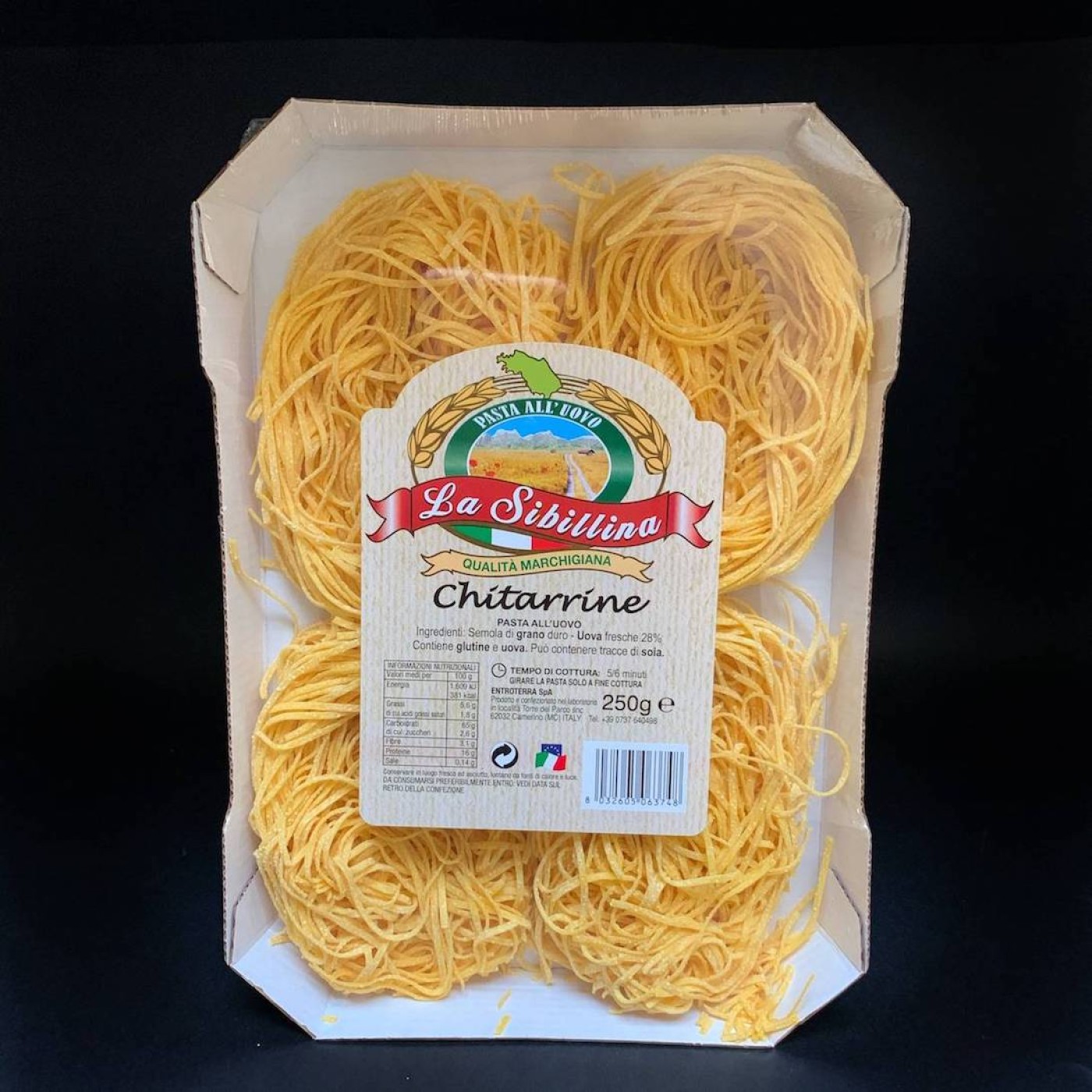 Chitarrine Pasta All’uovo – оригінальна яєчна лапша від італійського виробника, яка походить з регіону Абруццо в центральній Італії. Вона має тонку та пласку форму, виготовлена з високоякісного борошна твердих сортів та свіжих яєць, а вагома особливість в тому, що її виготовляють вручну.