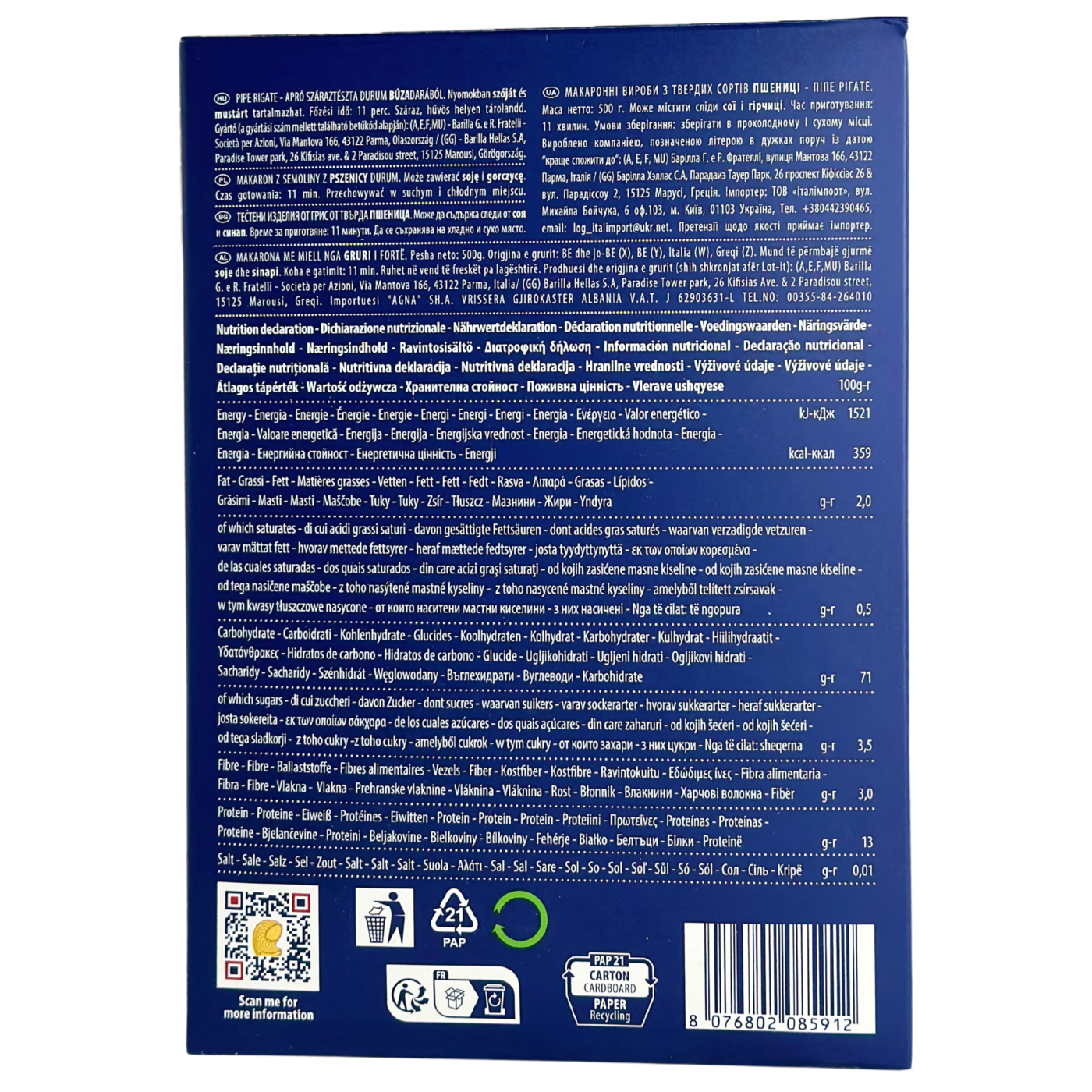 Паста Піпе Рігате Barilla n.91 Pipe Rigate 500 г — це класичний вид пасти від італійського бренду Barilla, який відомий своєю якістю та традиціями у виробництві макаронних виробів. Піпе Рігате мають характерну форму великих трубочок з борозенками на поверхні, що дозволяє їм чудово утримувати соуси та інші інгредієнти. Завдяки такій структурі вони ідеально підходять для різноманітних соусів, зокрема для густих томатних, сирних або м'ясних соусів.