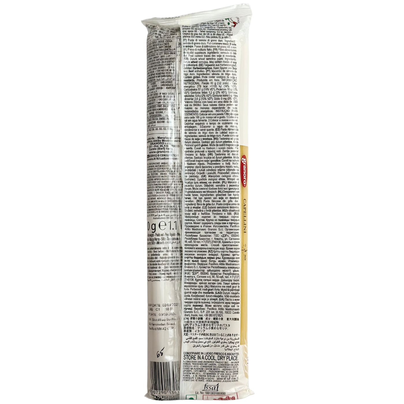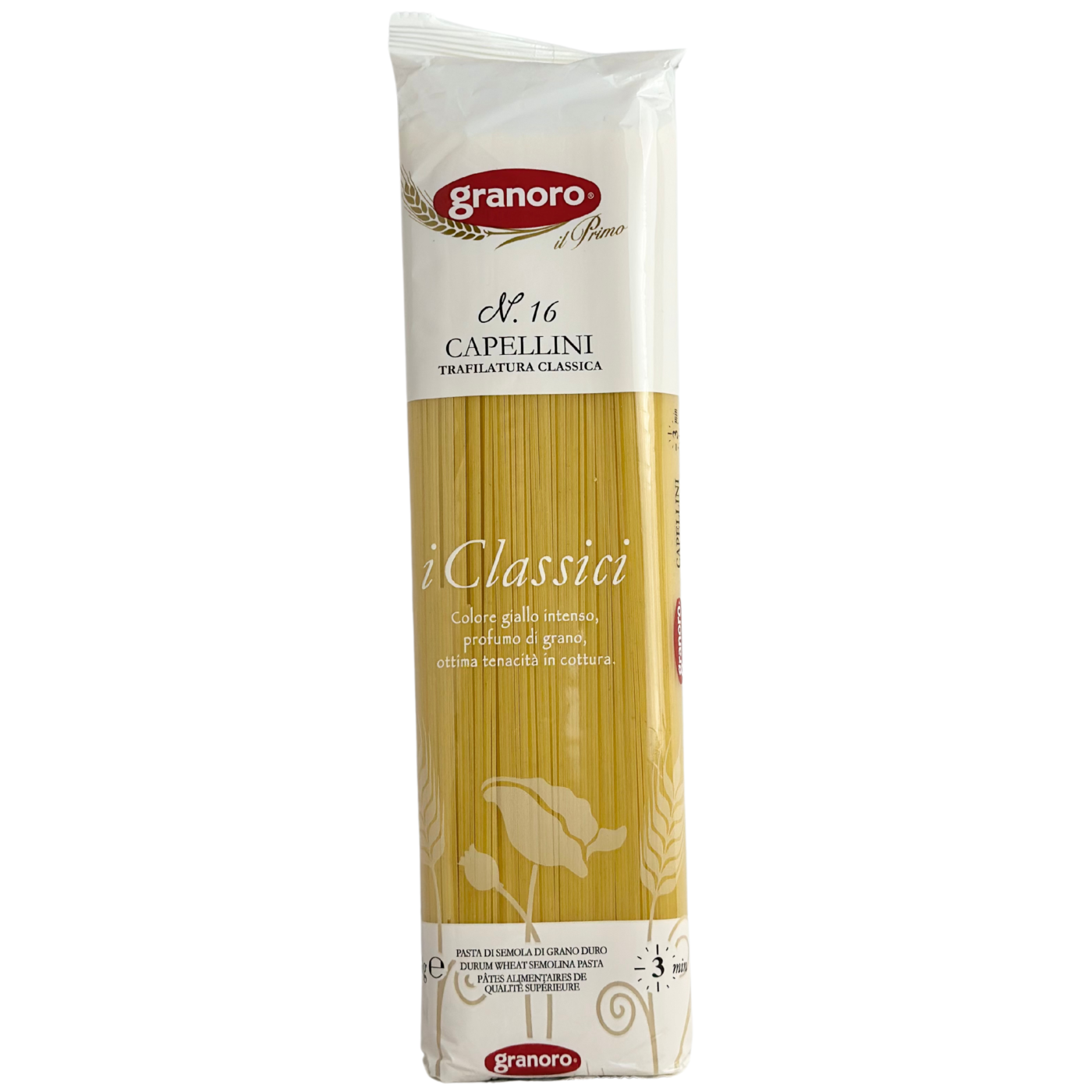 Спагетті Capellini від Granoro in Primo - це надзвичайно тонкі і довгі італійські макарони, відомі також як ангелсьскі волосся. Вони виготовлені з високоякісного пшеничного борошна і мають ніжний, ароматний смак. Ці макарони ідеально підходять для приготування легких і елегантних страв, таких як паста з соусом, морепродуктами або травами. Завдяки своїй тонкій текстурі, Spagheti Capellini додають елегантності будь-якому блюду і відмінно поєднуються з різноманітними соусами і начинками.