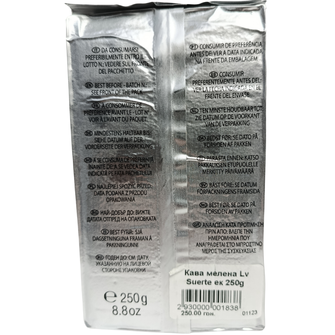 Кава Lavazza Suerte містить виключно зерна декількох сортів робусти, тому вміст кофеїну в ній значно більший, ніж в напоях з зернами арабіки. Це неодмінно сподобається любителям справжнього міцного смаку кави з легкою гіркотою і без кислинки.