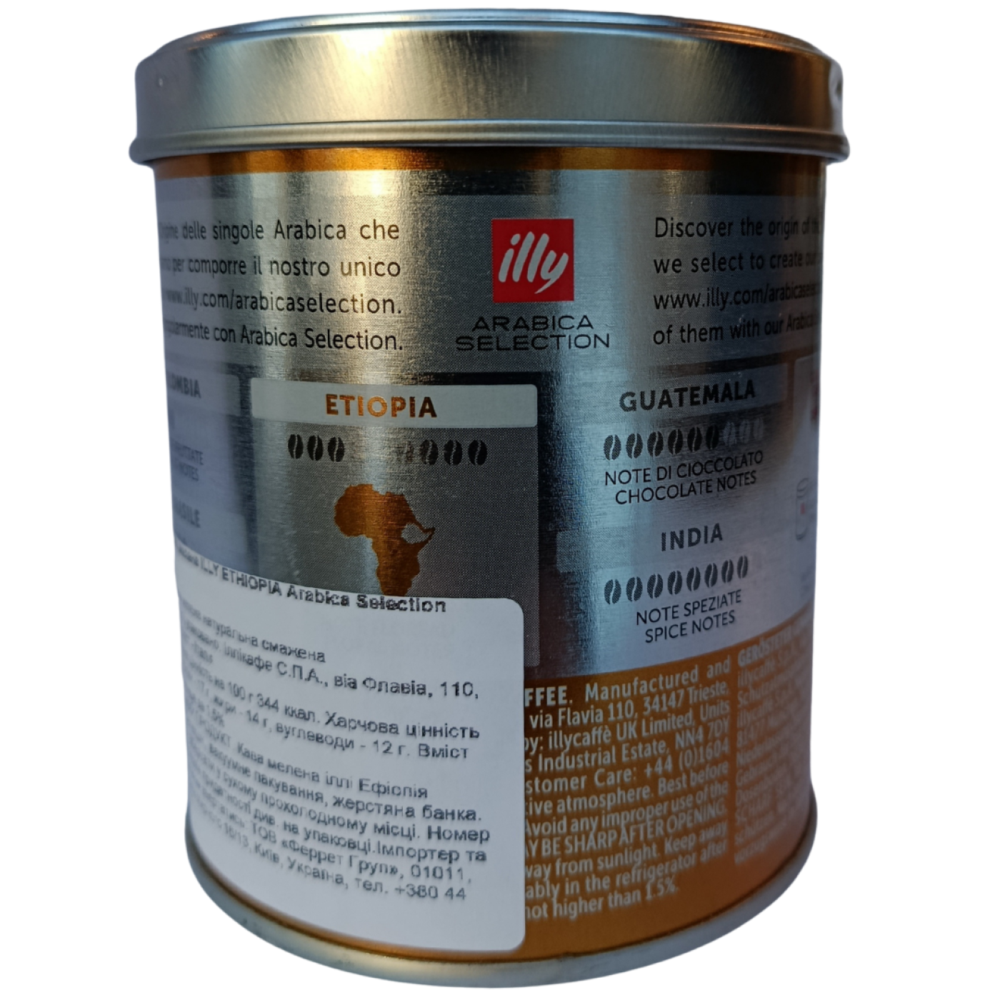 Arabica selection Etiopia – мелена кава від італійського виробника Illy, виготовлена з найкращих зерен арабіки середнього обсмаження, які походять з плантацій в Ефіопії. Відбірні зерна делікатно обробляються та перемелюються найкращими спеціалістами, завдяки чому вдається отримати продукт найвищої якості. Смак солодкуватий з легкою гірчинкою та ледве відчутною кислинкою, аромат здивує квітковими нотами, зокрема жасмину, а також цитрусовими.
