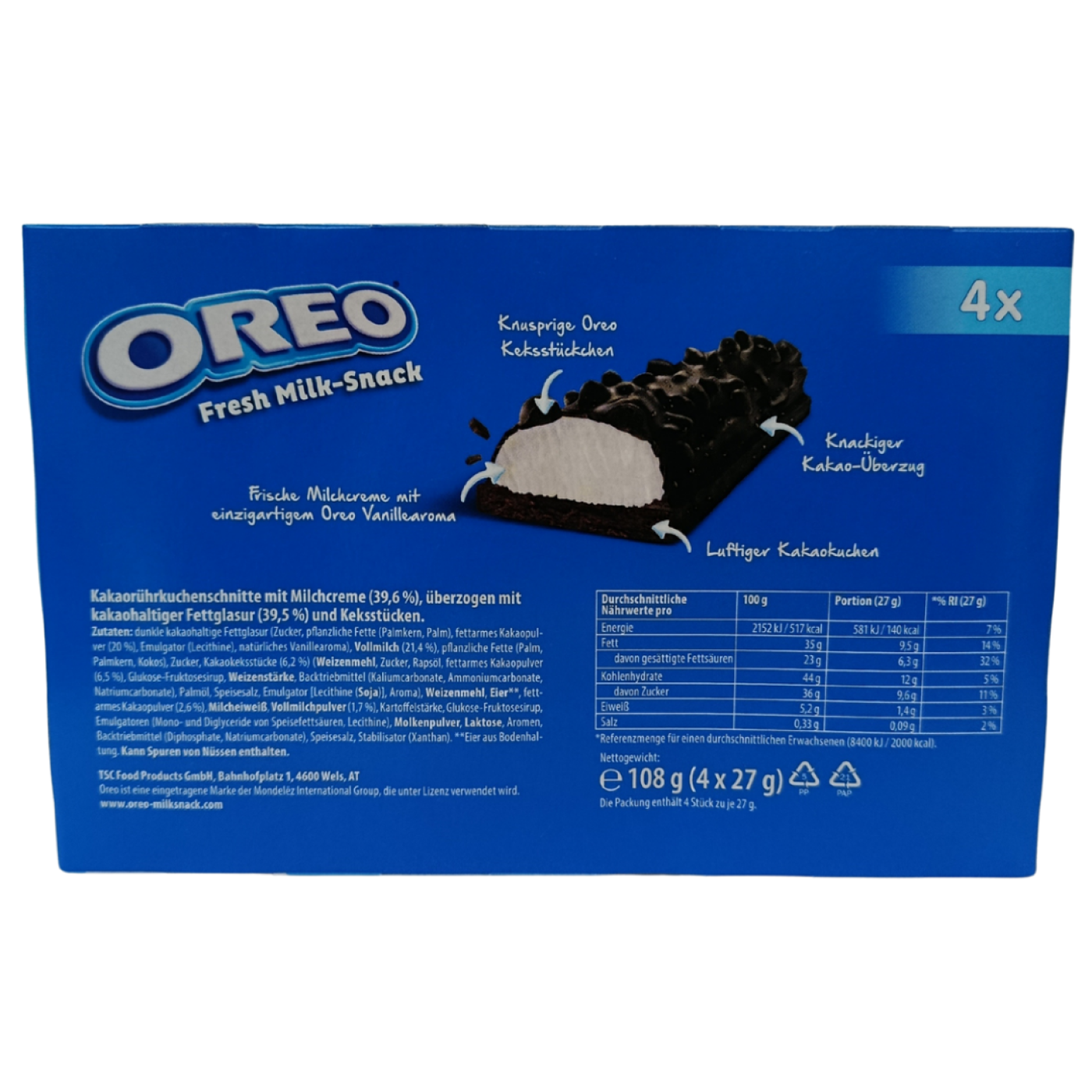 Молочні снеки Oreo fresh milk-snacк- це поєднання шоколадного бісквіта, хрустких шматочків печива Орео, ніжної вершково- молочної начинки, вкрите шоколадною глазур'ю. Ви досі це не куштували? Тоді саме час! Ідеально підійдуть як для Вашої малечі для насолоди в дорозі, у школі, на роботі або щоразу, коли Ви жадаєте смачної закуски Орео! Легко носити його із собою в сумці, рюкзаку або кишені, щоб завжди мати під рукою смачні ласощі Орео.