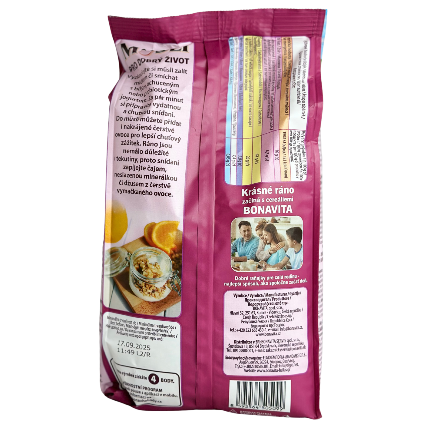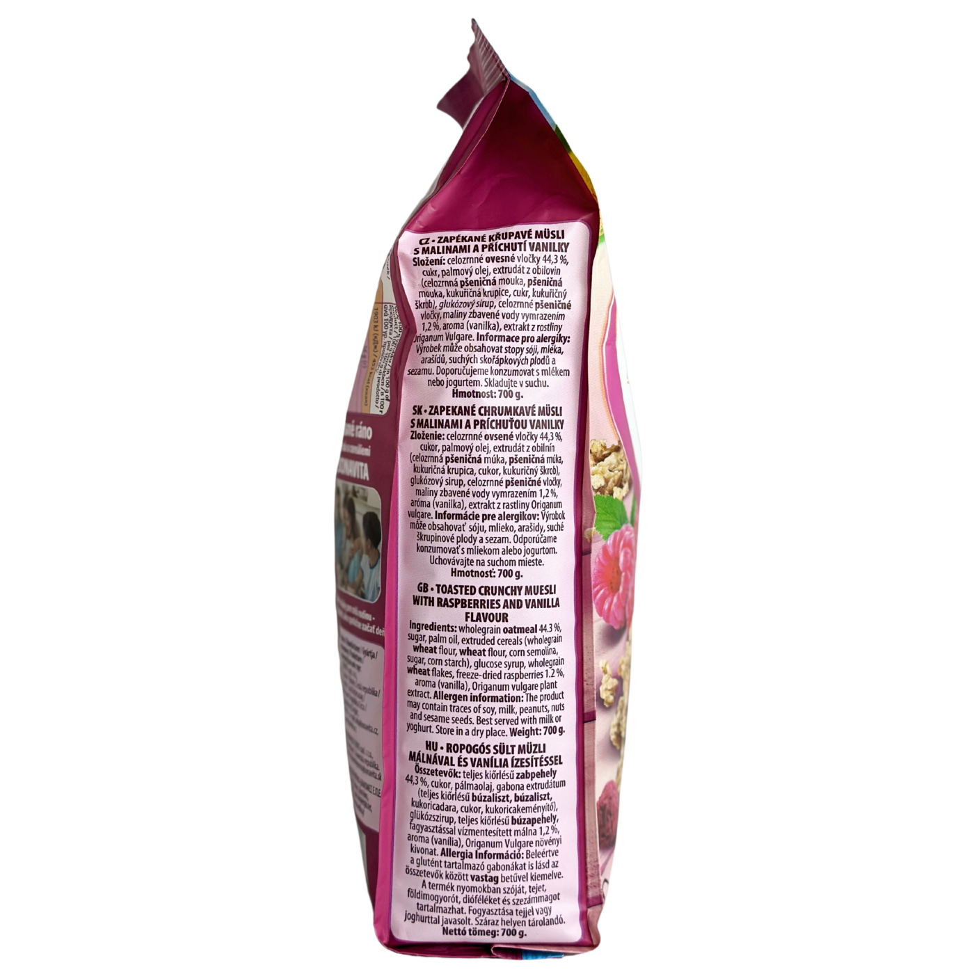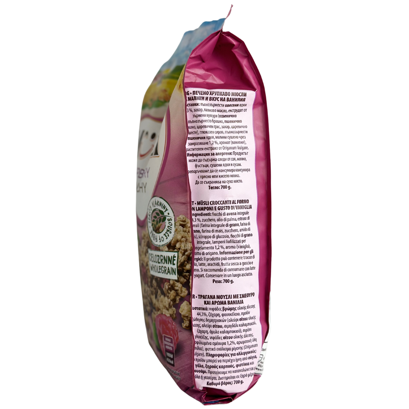 Хрумкі запечені мюслі з малиновими кранчами. Основа з цільних злаків і вівсяних пластівців є джерелом харчових волокон і забезпечує тривале відчуття ситості, а малинові кранчі додають приємну ягідну кислинку та насичений смак. Завдяки запіканню мюслі мають хрумку текстуру. Можна заливати як молоком так і йогуртом.