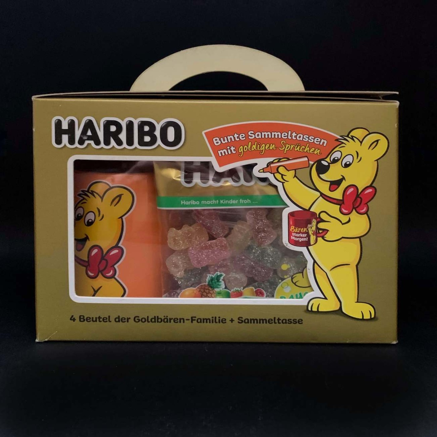 Виробник Харібо пропонує чудову ідею для подарунку, який сподобається дорослим та особливо дітям. Він складається з 4 упаковок желейних цукерок в формі ведмедиків: 2 упаковки класичних (по 100 г), 1 упаковка з кислою посипкою (100 г) і ще 1 упаковка желейок, виготовлених з додаванням соку (85 г). Всі вони мають фруктові смаки та виготовлені без використання штучних барвників та ароматизаторів.