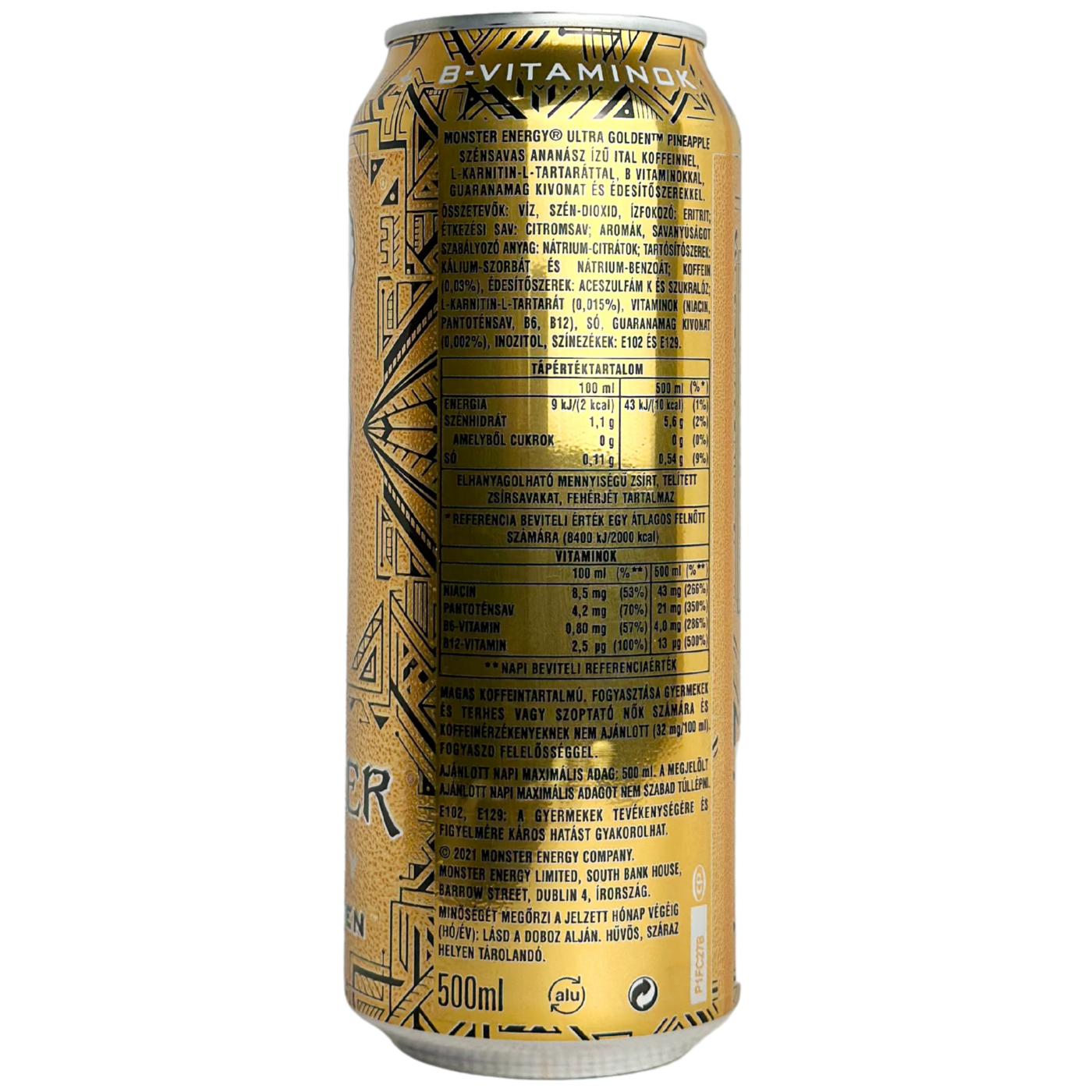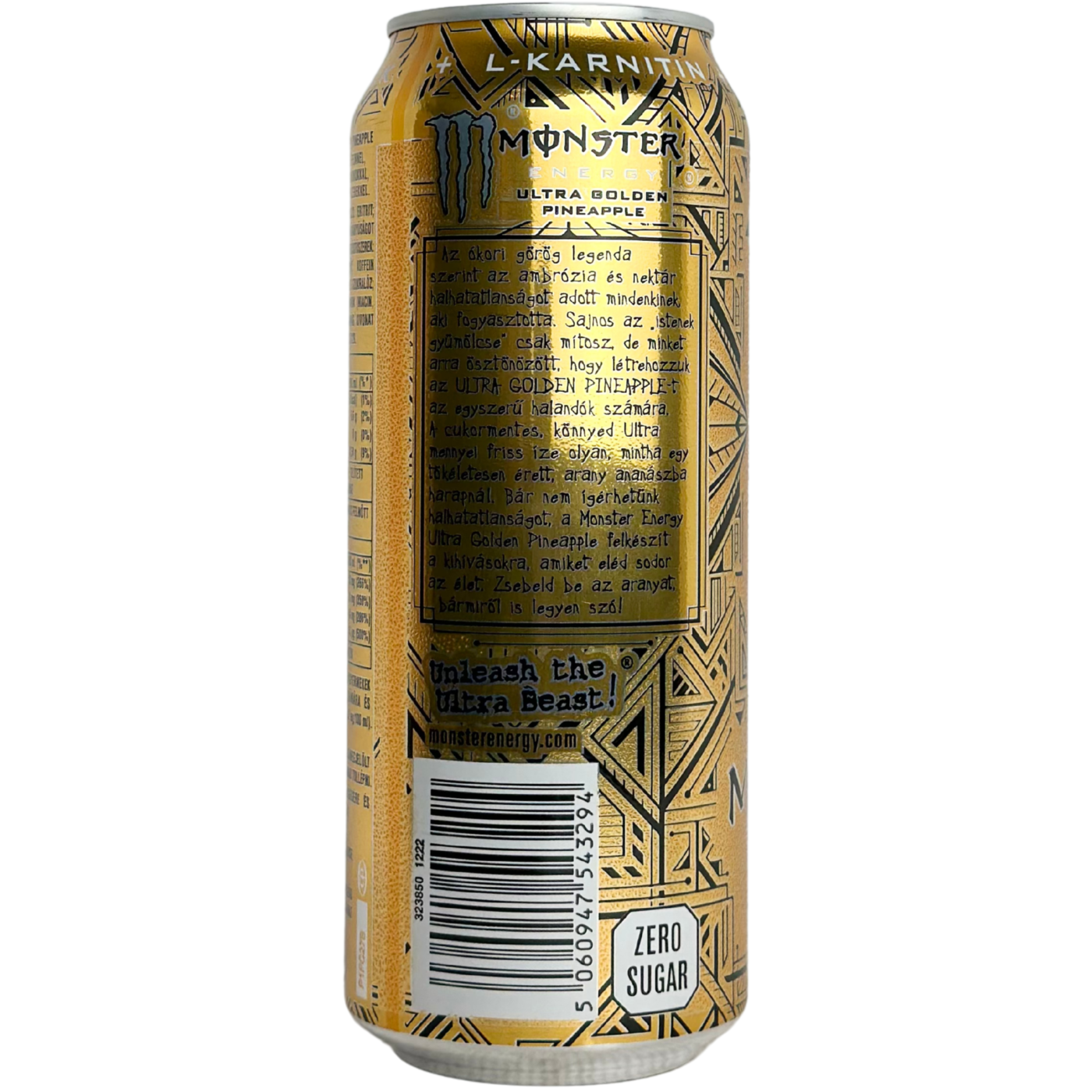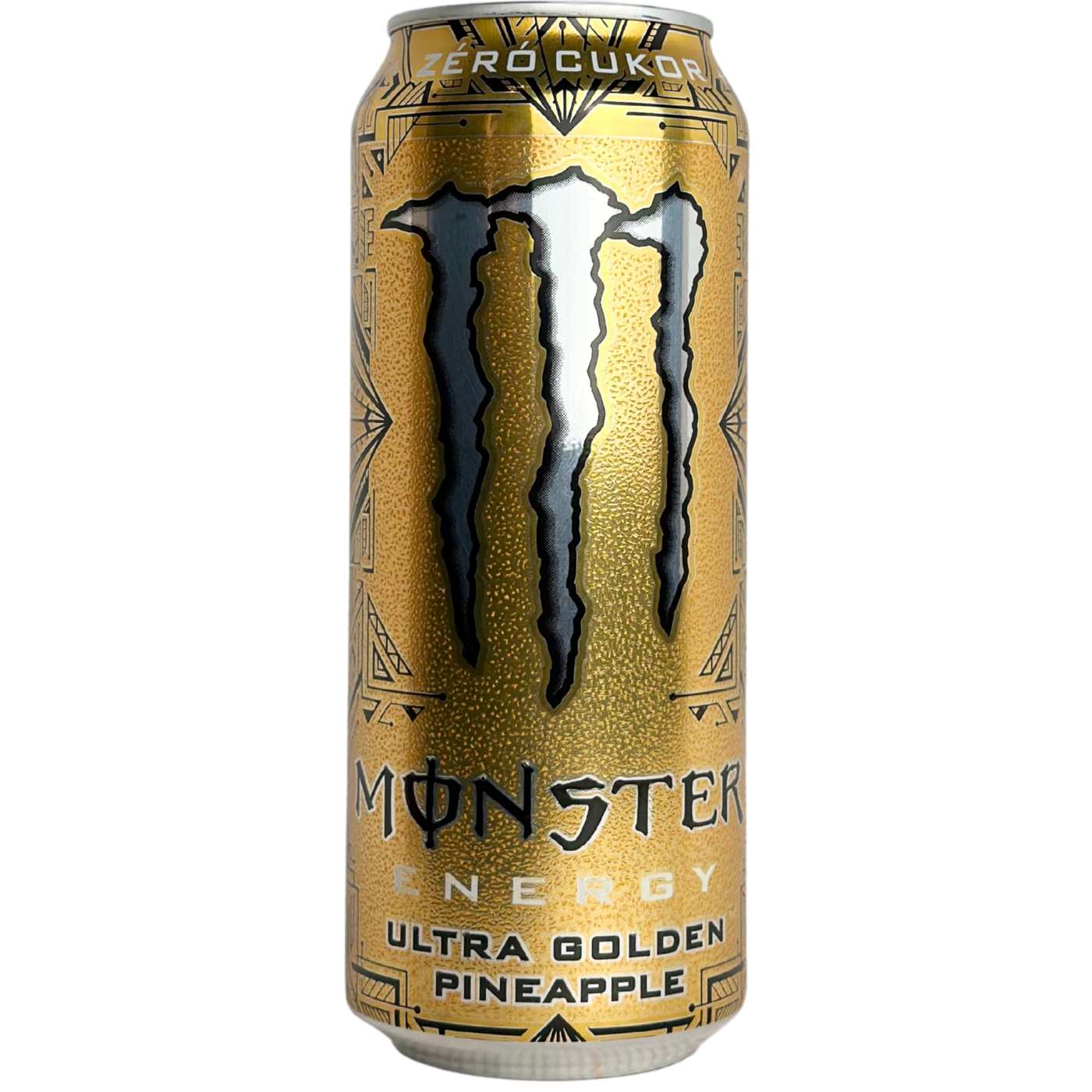 Monster Energy Ultra Gold Pineapple — це газований енергетичний напій без цукру зі смаком ананаса та тропічних фруктів. Він містить легендарну енергетичну формулу Monster з кофеїном та вітамінами групи В, що допомагає підвищити енергію та концентрацію без зайвих калорій. Напій має солодкий смак з кислинкою, що нагадує стиглий золотистий ананас.