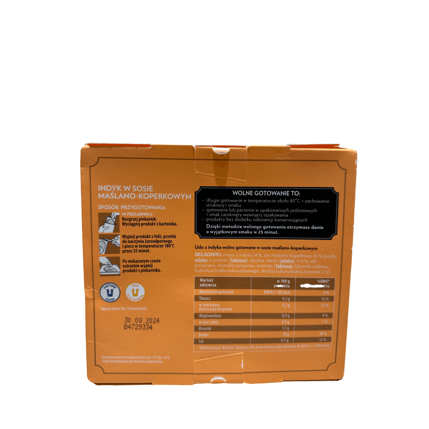 Філе індика у вершково- грибному соусі- дуже смачна страва, яка готується дуже швидко й просто! Завдяки соусу філе індички стає м'яким та соковитим. Поєднання всіх інгредієнтів надає страві неповторного вишуканого смаку і неймовірної ніжності. Можна подавати з будь- яким гарніром: макаронами, рисом, кус- кусом, картоплею або овочами. Розігрійте духовку, вийміть виріб з коробки, зніміть його з фольги, викладіть у форму для запікання і запікайте при t180° 25хв.