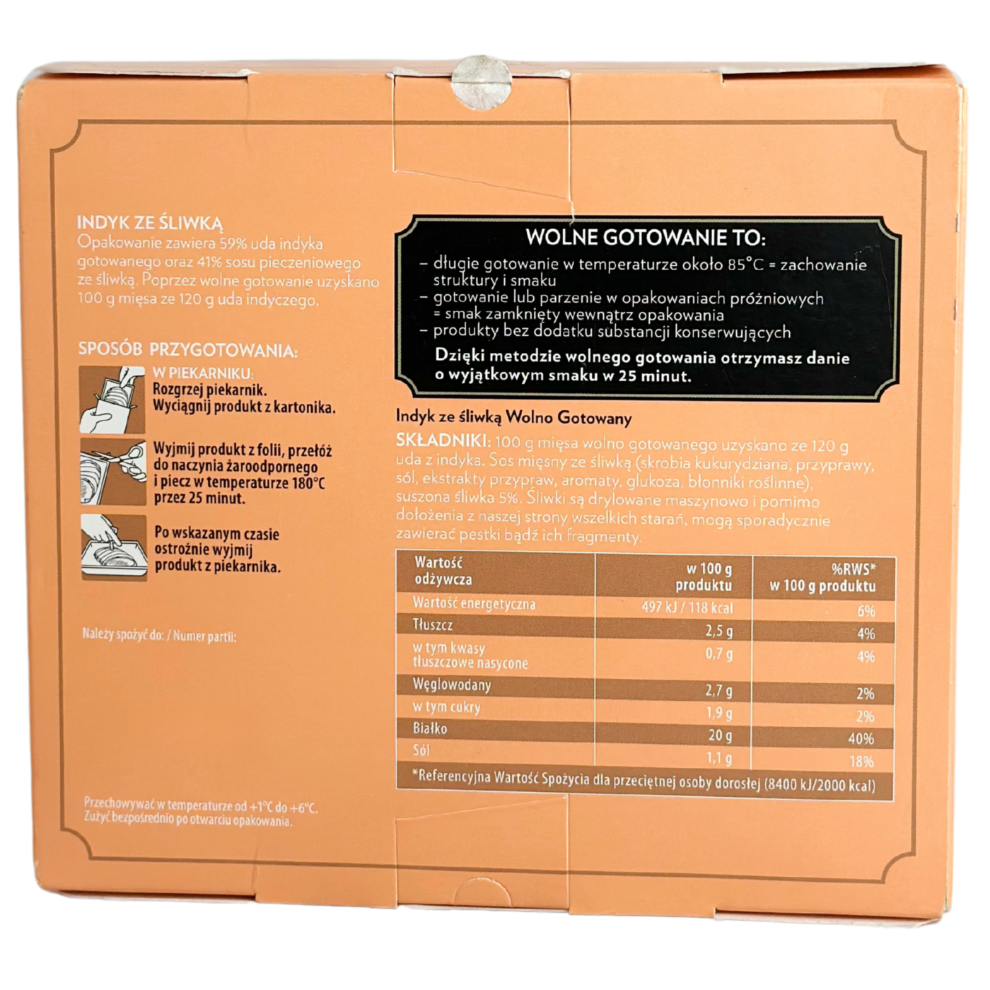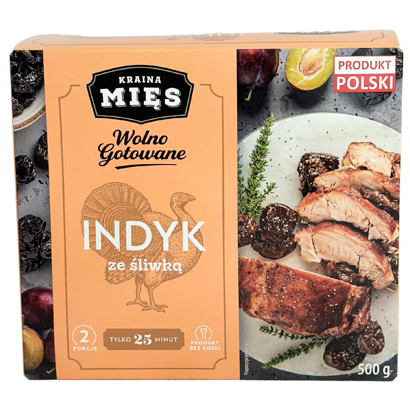 Філе індика Kraina Mięs з чорносливом — це ніжне м’ясо індика, поєднане з ароматним чорносливом для справжніх гурманів. Страва має вишуканий, трохи солодкуватий смак і приємну текстуру — ідеально підходить для вечері чи святкового столу. Мʼясо індика — це джерело білка з низьким вмістом жиру, а чорнослив додає йому соковитості та витонченого аромату. Страва готова до запікання, економить час і дарує задоволення від кожного шматочка.