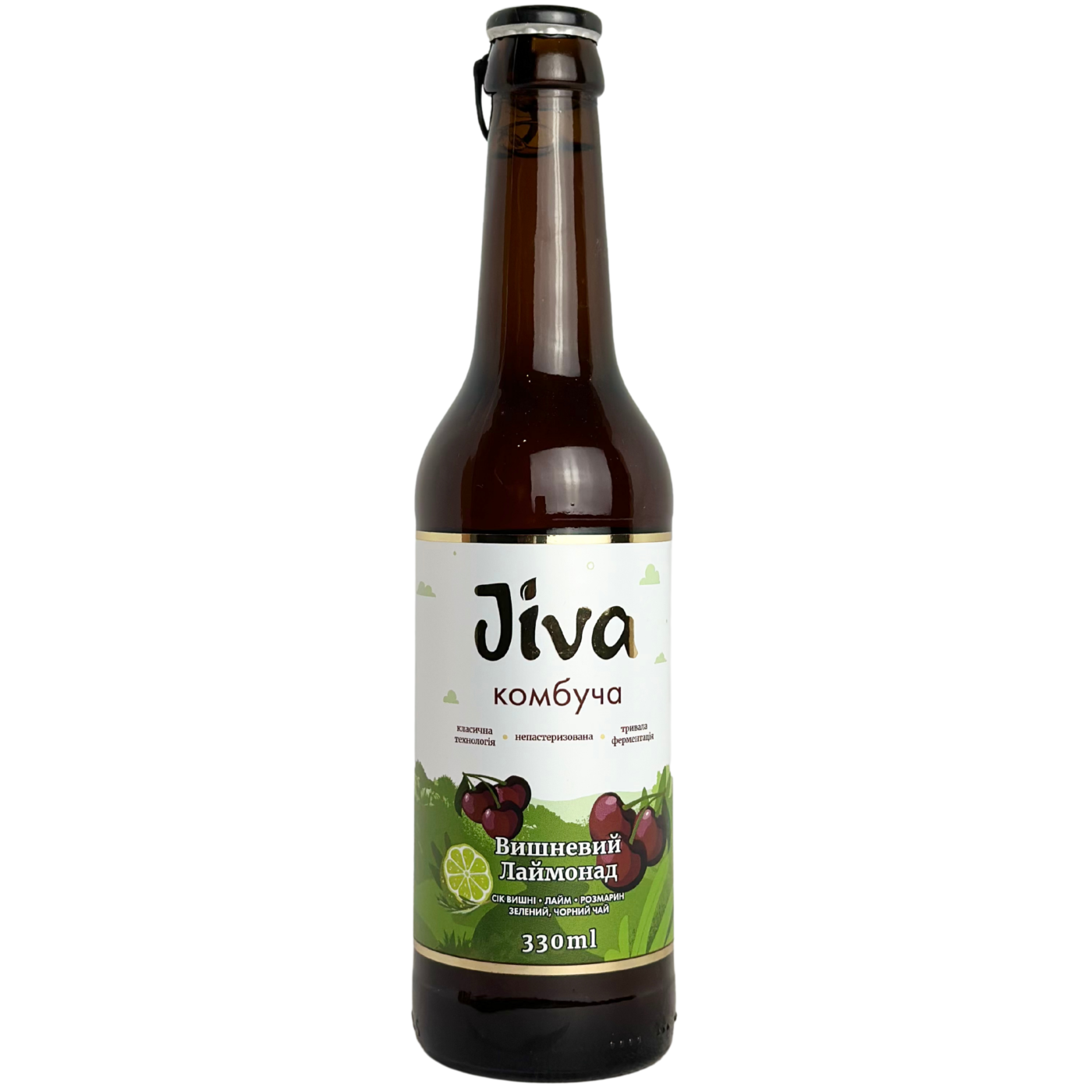Комбуча Jiva Вишневий Лаймонад - це напій  безалкогольний соковмісний слабогазований з соком вишні та пюре лайма. Солодкуватий смак стиглих фруктів з ніжним карамельним відтінком, легкою кислинкою та тонким трав'яно хвойним ароматом створює неповторний насичений оксамитовий лимонадний напій.
