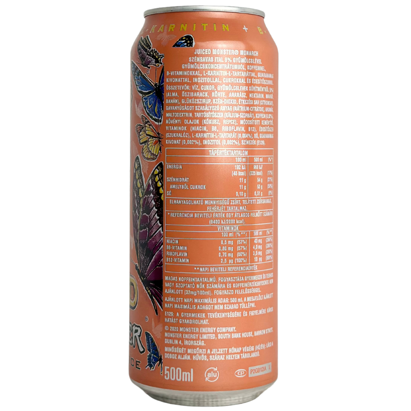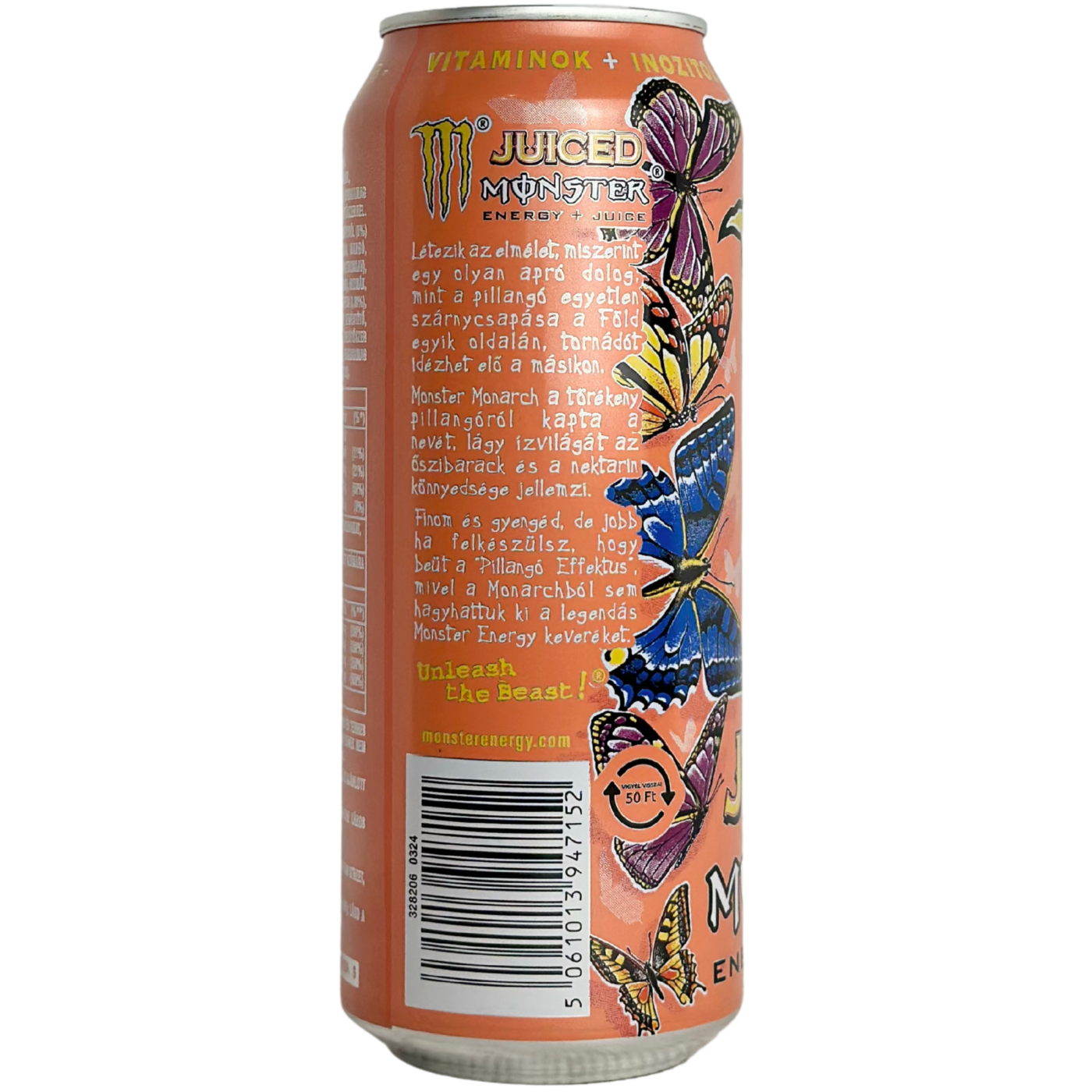 Енергетичний напій Monster Energy+Juice Monarch зі смаком персика та нектарину. Газований енергетичний напій з 5 % концентратом фруктового соку, таурином, кофеїном, L- карнітином, інозитолом та вітамінами групи В.