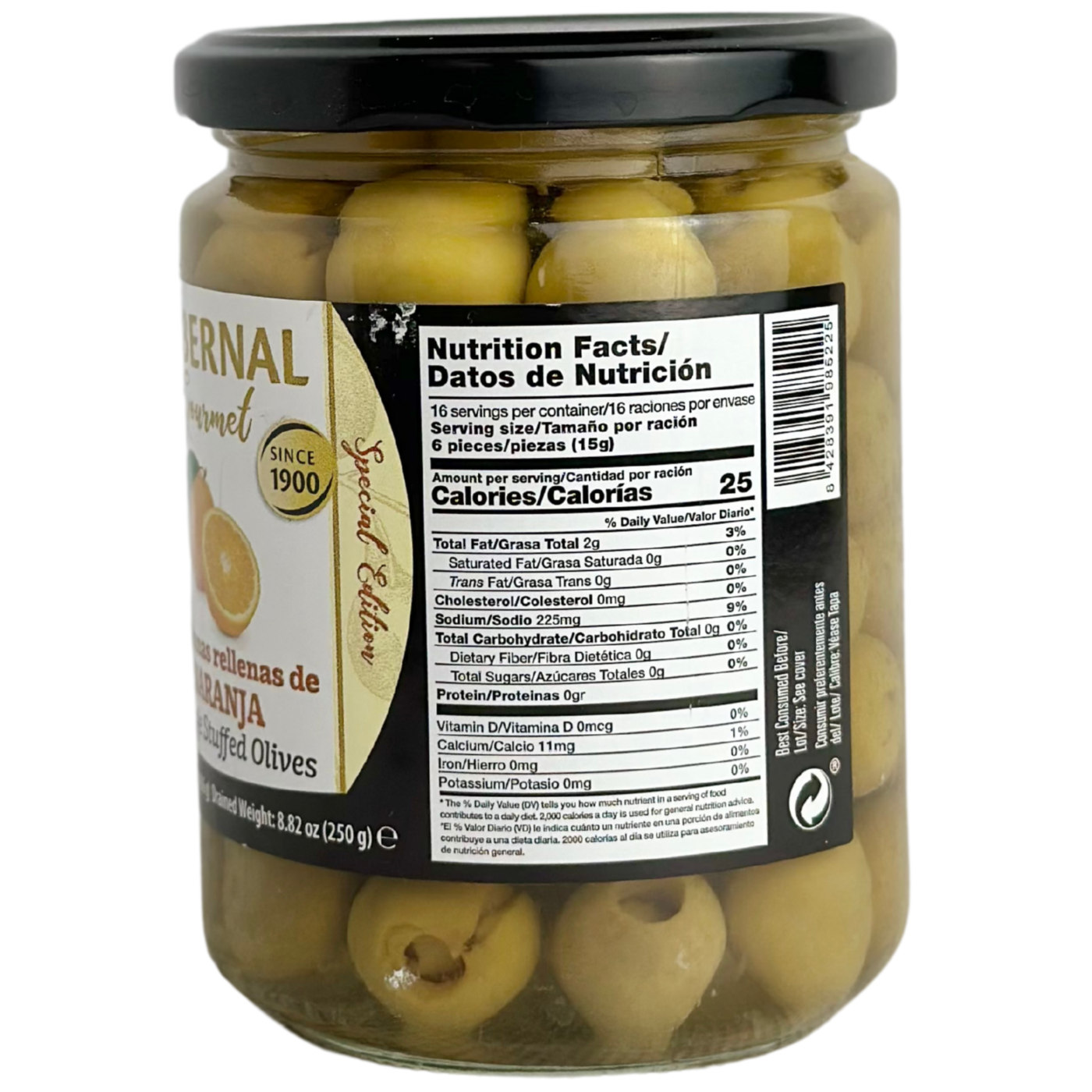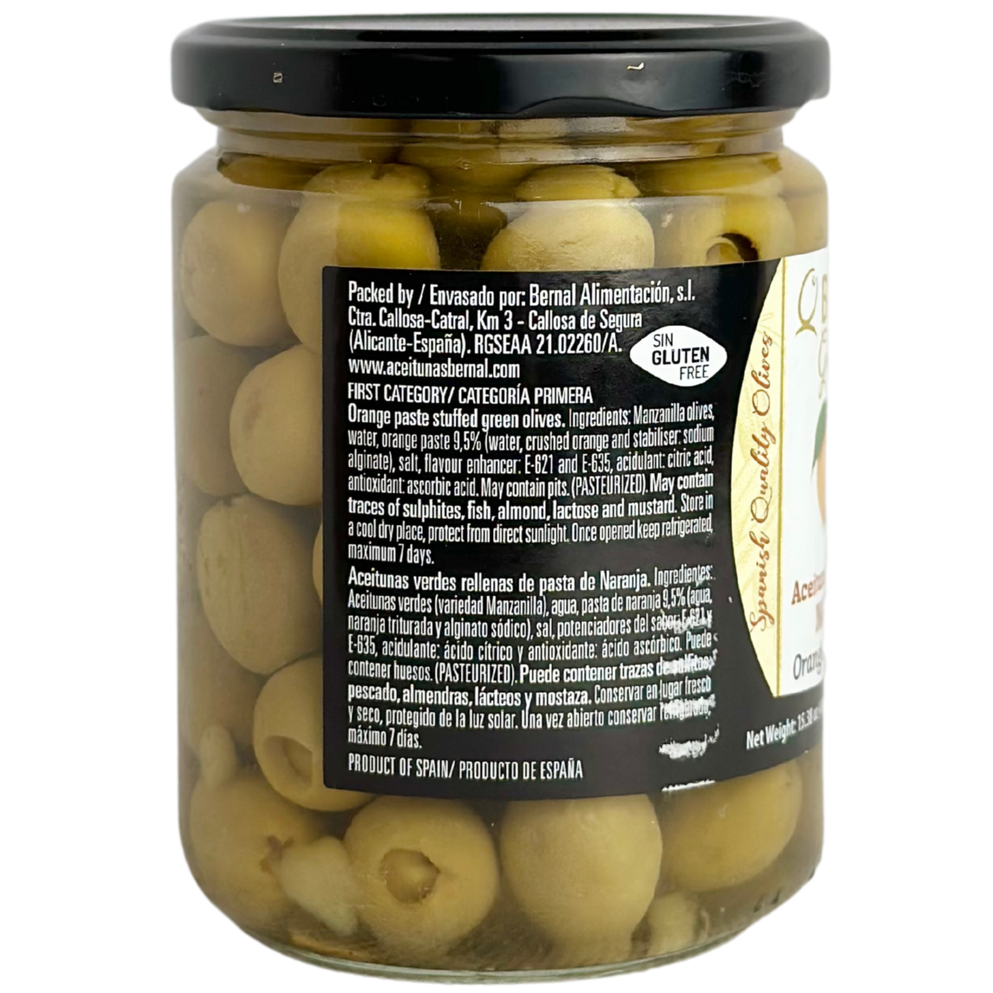Оливки фаршировані апельсином BERNAL - великі зелені оливки з соковитою начинкою зі свіжого апельсина, яка дарує легку солодку цитрусову нотку в кожному шматочку. Контраст між м’якою оливкою і яскравою фруктовою серцевиною створює несподіваний і приємний смаковий вибух. Ідеальні для салатів, закусок або сирних тарілок, вони роблять страви більш цікавими, ароматними та по-справжньому середземноморськими.