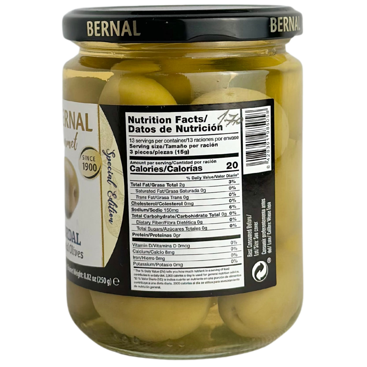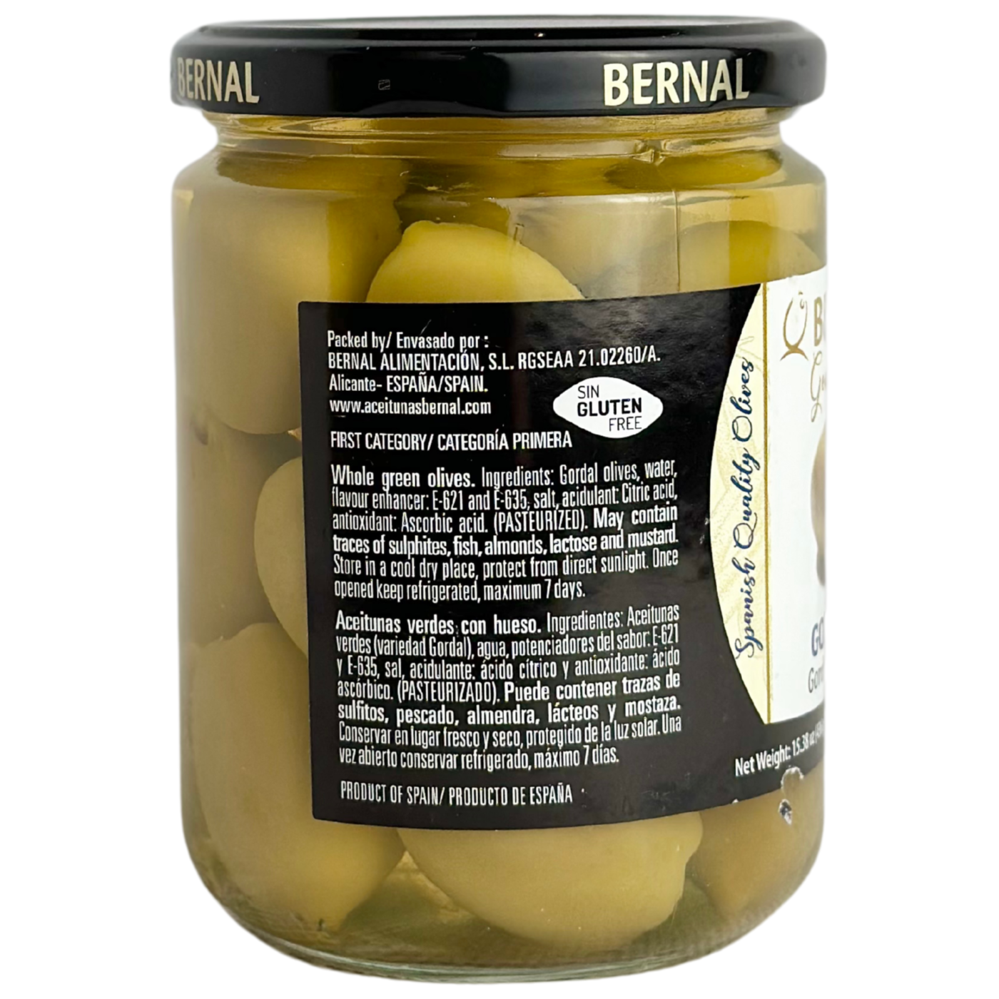 Ці оливки вирощуються в Іспанії, де сорт Гордаль славиться своїми великими розмірами та м'ясистою текстурою. Вони мають світло-зелений колір і ніжний, вишуканий смак, що робить їх ідеальними для споживання як самостійна закуска або в поєднанні з іншими стравами. Виготовлені без оцту, барвників та консервантів. Оливки Bernal Gordal відображають високі стандарти якості та натуральності. Вони підходять для людей, які дотримуються безглютенової дієти або шукають продукти без штучних добавок.