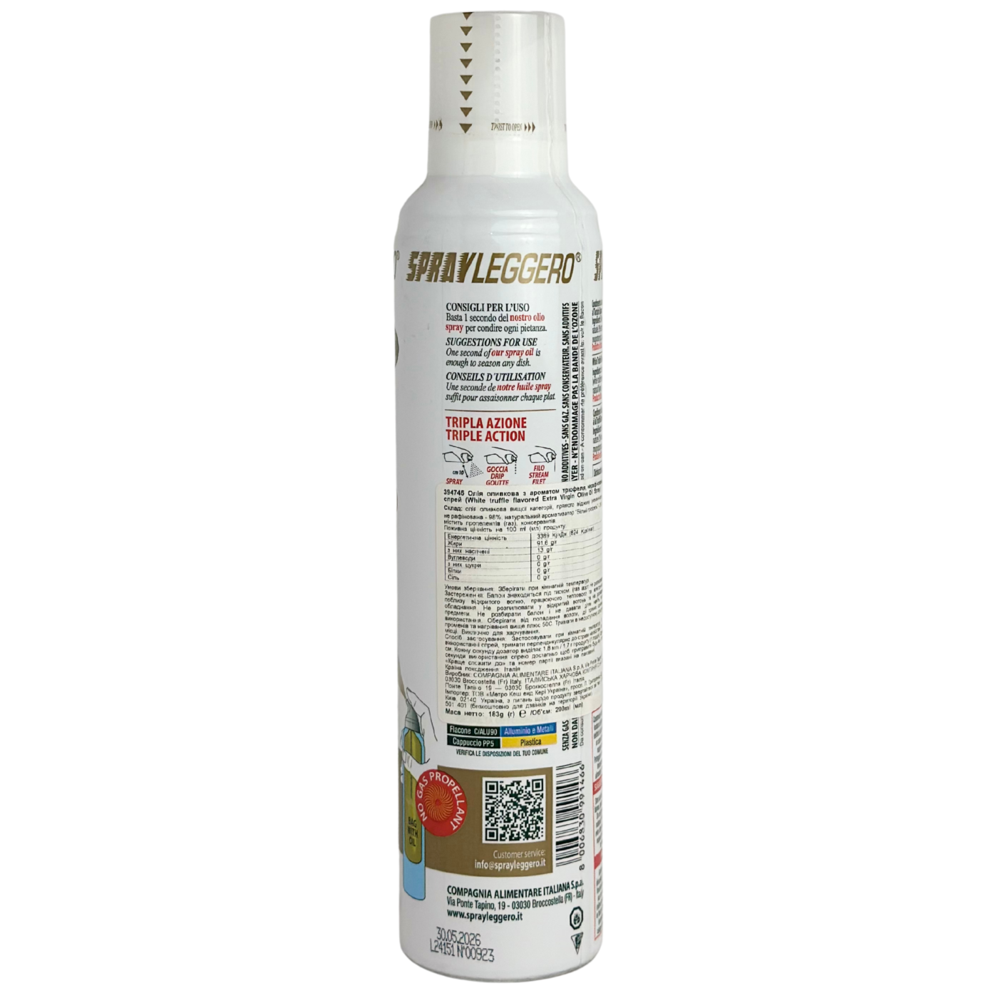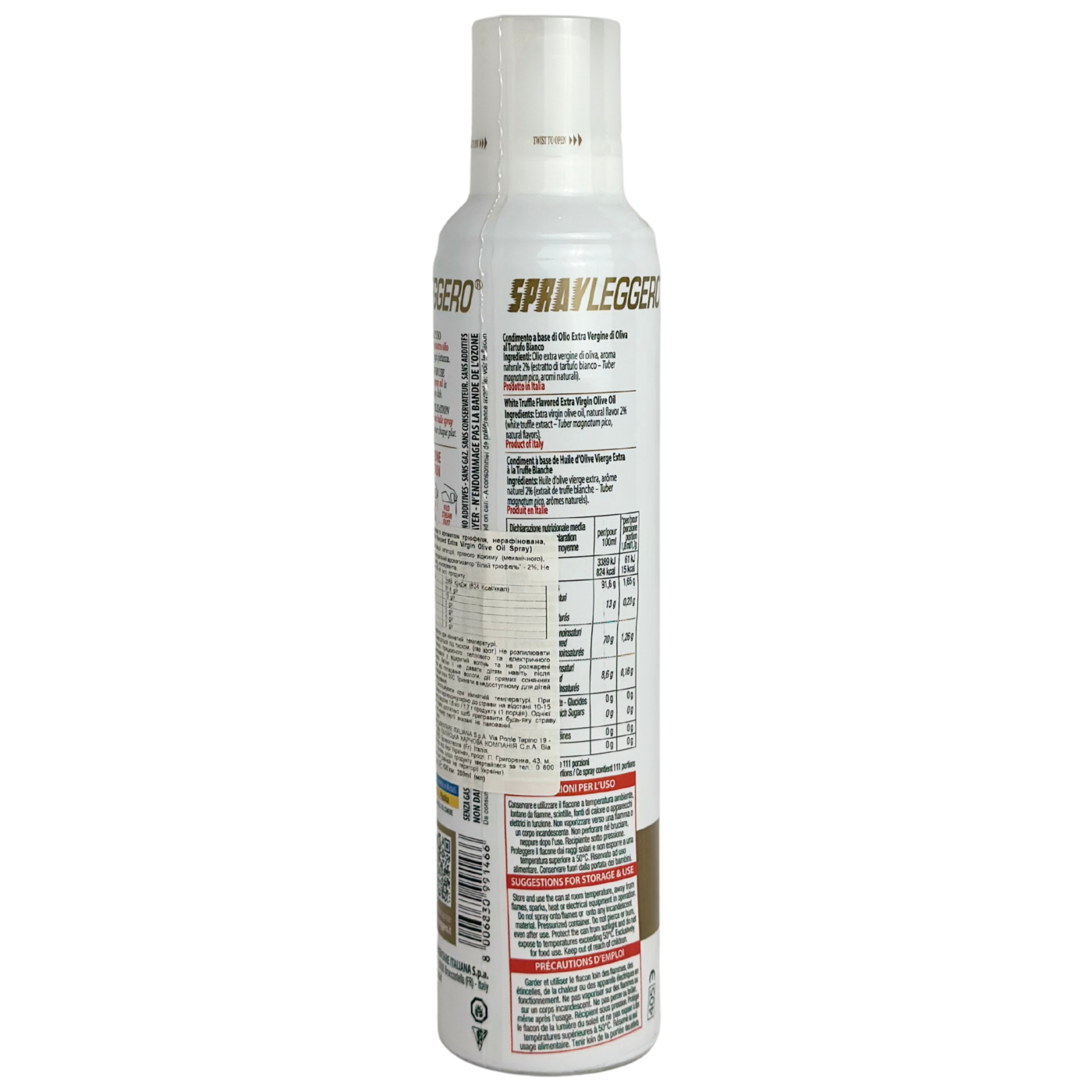 Олія-спрей Tartufo Bianco Spray – це продукт на основі оливкової олії Екстра Вірджин, яка отримується методом першого холодного віджиму, з ароматом білого трюфеля. Олія має характерний насичений смак, який вже давно припав до душі усім гурманам. Ще один плюс – зручне упакування з розпилювачем, що дозволяє використовувати продукт виключно в тій кількості, що потрібно. Можливі три способи розпилення: спрей, струмінь та крапля. Також важливо звернути увагу на економічність, адже одна банка олії в спрею дорівнює 3 літрам олії в звичайній банці!