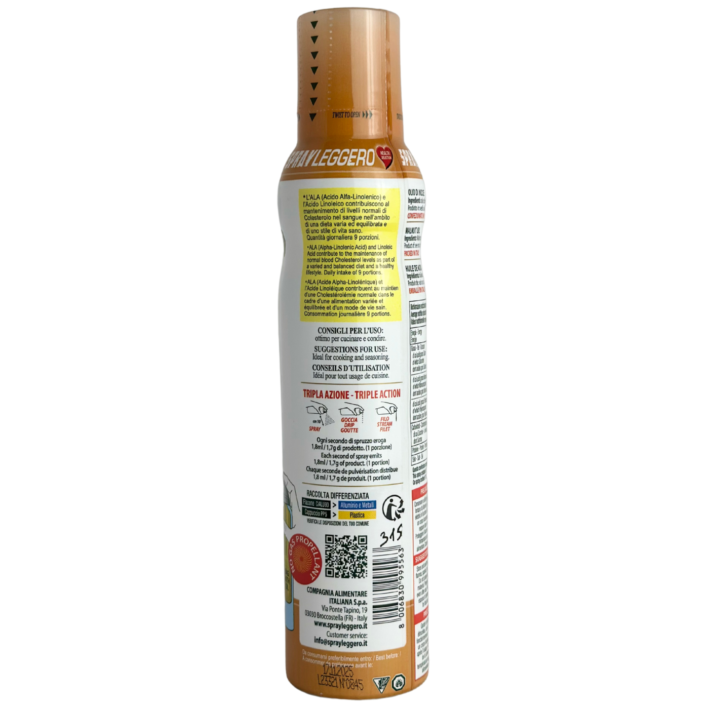 Олія в спреї з грецького горіха Olio di Noce Mantova 200 мл — це високоякісна олія, виготовлена з грецьких горіхів, яка має ніжний, але виразний смак. Завдяки зручному формату спрею, олія легко наноситься на страви, дозволяючи контролювати кількість використовуваного продукту. Вона ідеально підходить для заправки салатів, приготування соусів, а також для обсмажування та запікання.