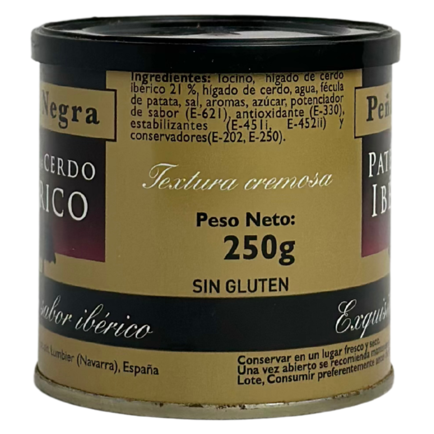 Pena Negra Pate de Cerdo Iberico – справжній делікатес, виготовлений із м'яса чорної іберійської свині. Ніжний і дуже смачний паштет не залишить байдужим нікого. До його складу входять свиняче м'ясо та печінка. Іберійські чорні свині як зовні відрізняються від своїх побратимів, а й живуть у особливих королівських умовах. Свинки переважно харчуються жолудом з іберійського дуба, що дуже позитивно впливає на смак та аромат сировини, з якого виготовлений паштет. Без глютену.